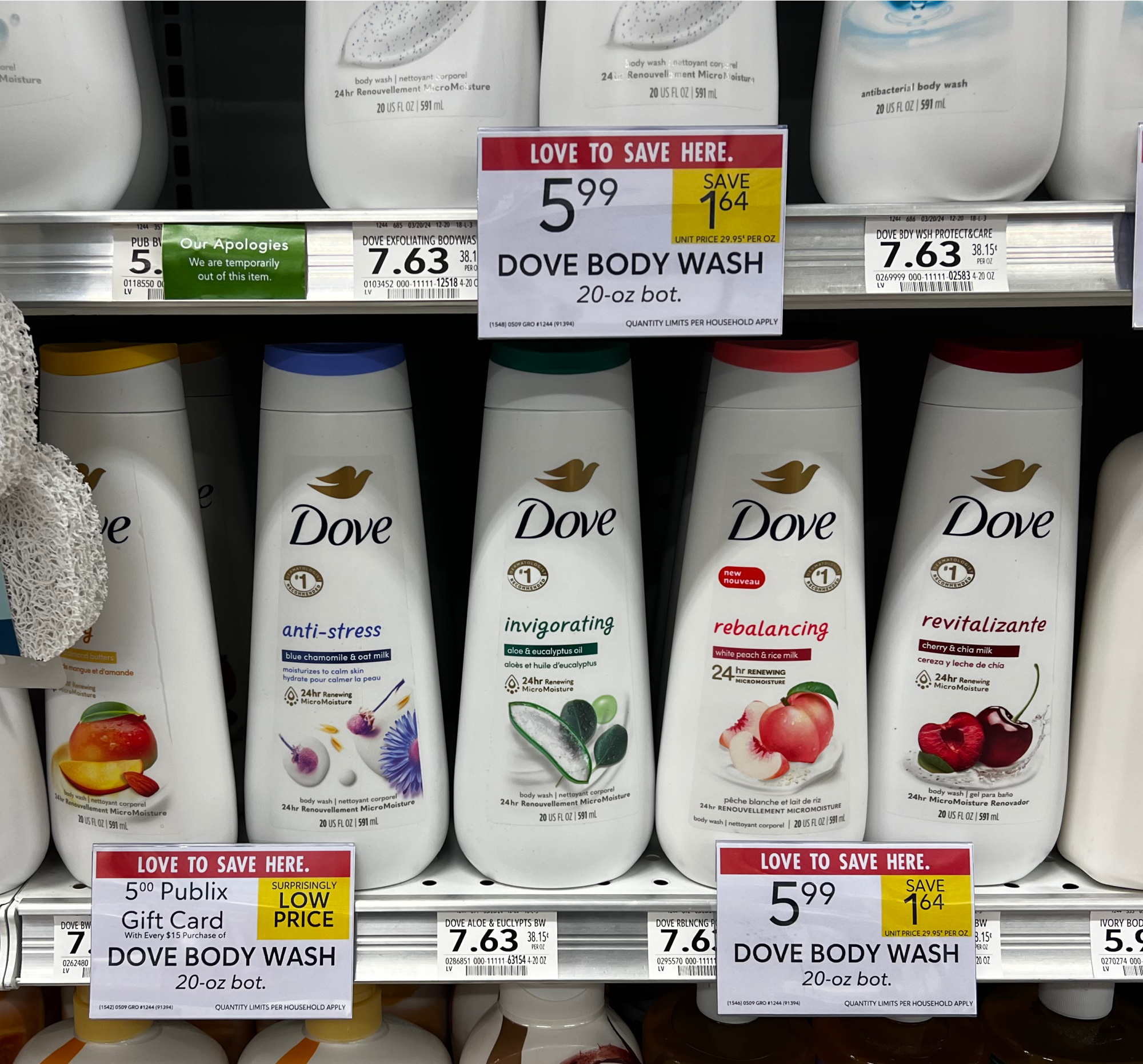 –$2/1 Dove Body Wash 20oz or larger, including Twin Packs (excludes trial and travel sizes) (Publix Digital Coupon)