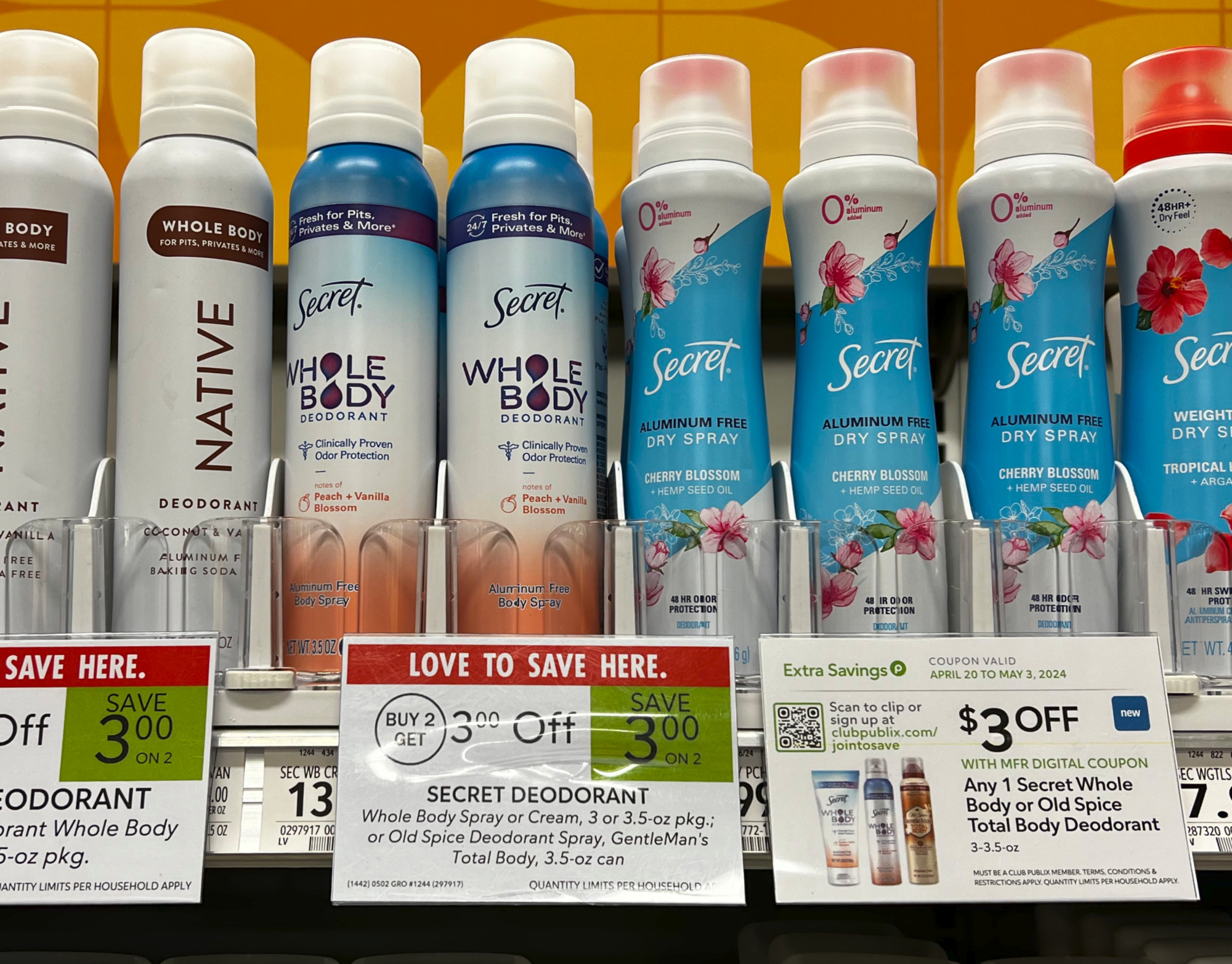 –$3/1 Secret Whole Body Deodorants (excludes trial/travel size). (excludes trial/travel size) (Publix Digital Coupon)