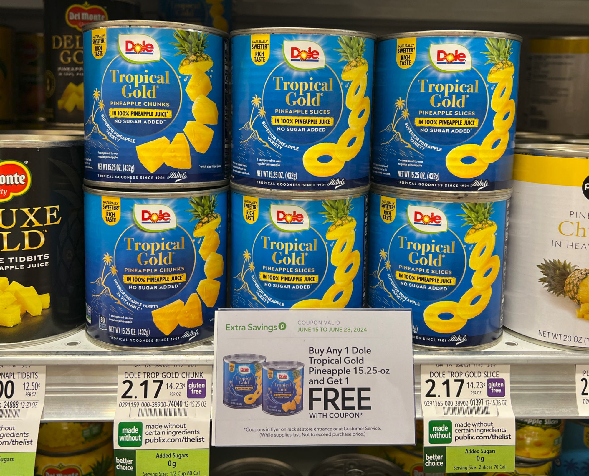 Grab a discount on the cans of Dole Tropical Gold Pineapple when you shop at Publix. Clip the coupon and pay just $1.09 per can… that’s a great price for some fruit!