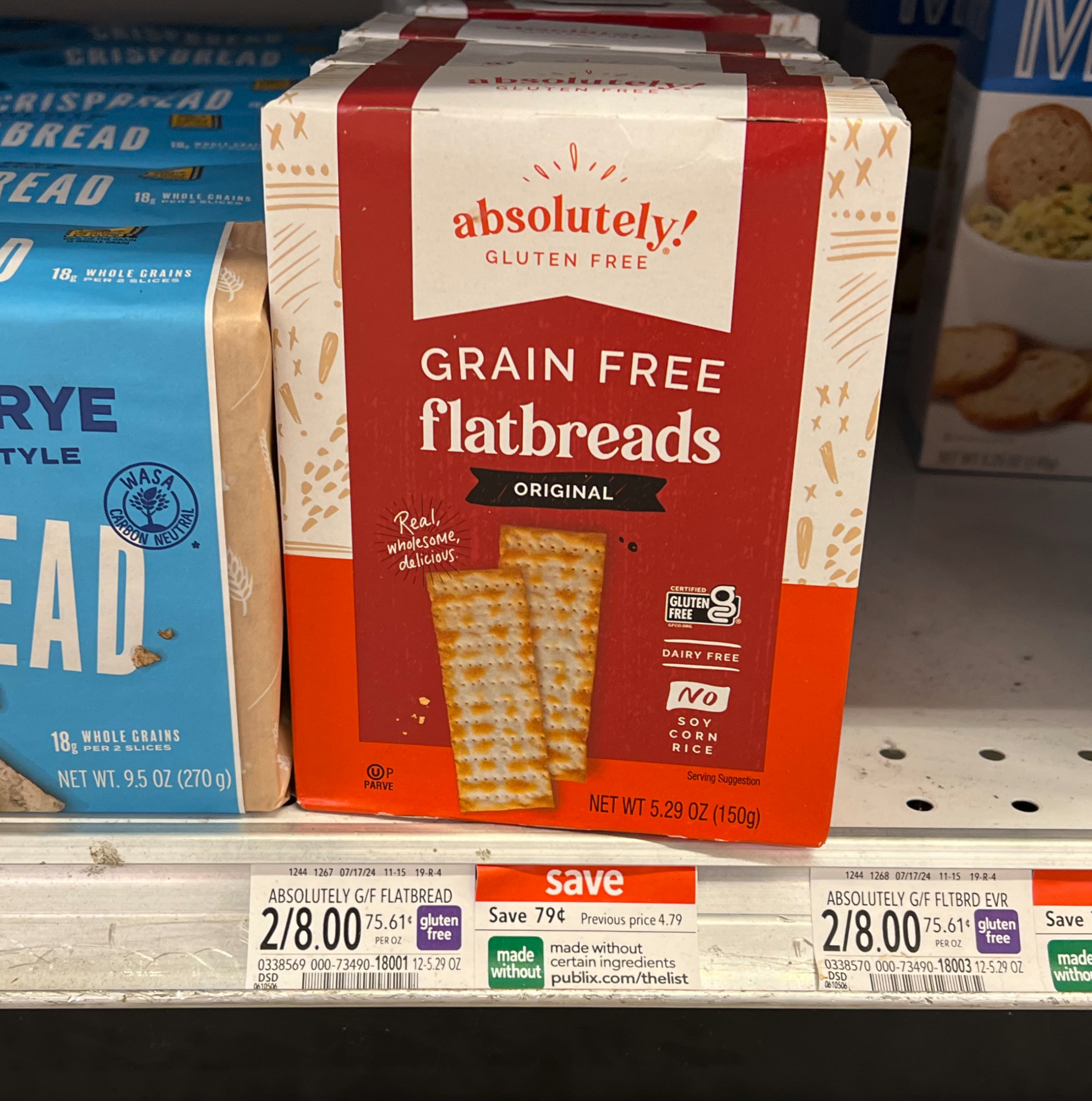 Head over to Publix to grab the boxes of Absolutely! Gluten Free Flatbreads for a nice price. Combine the sale and cash back offer to pay just $2.75 per box!