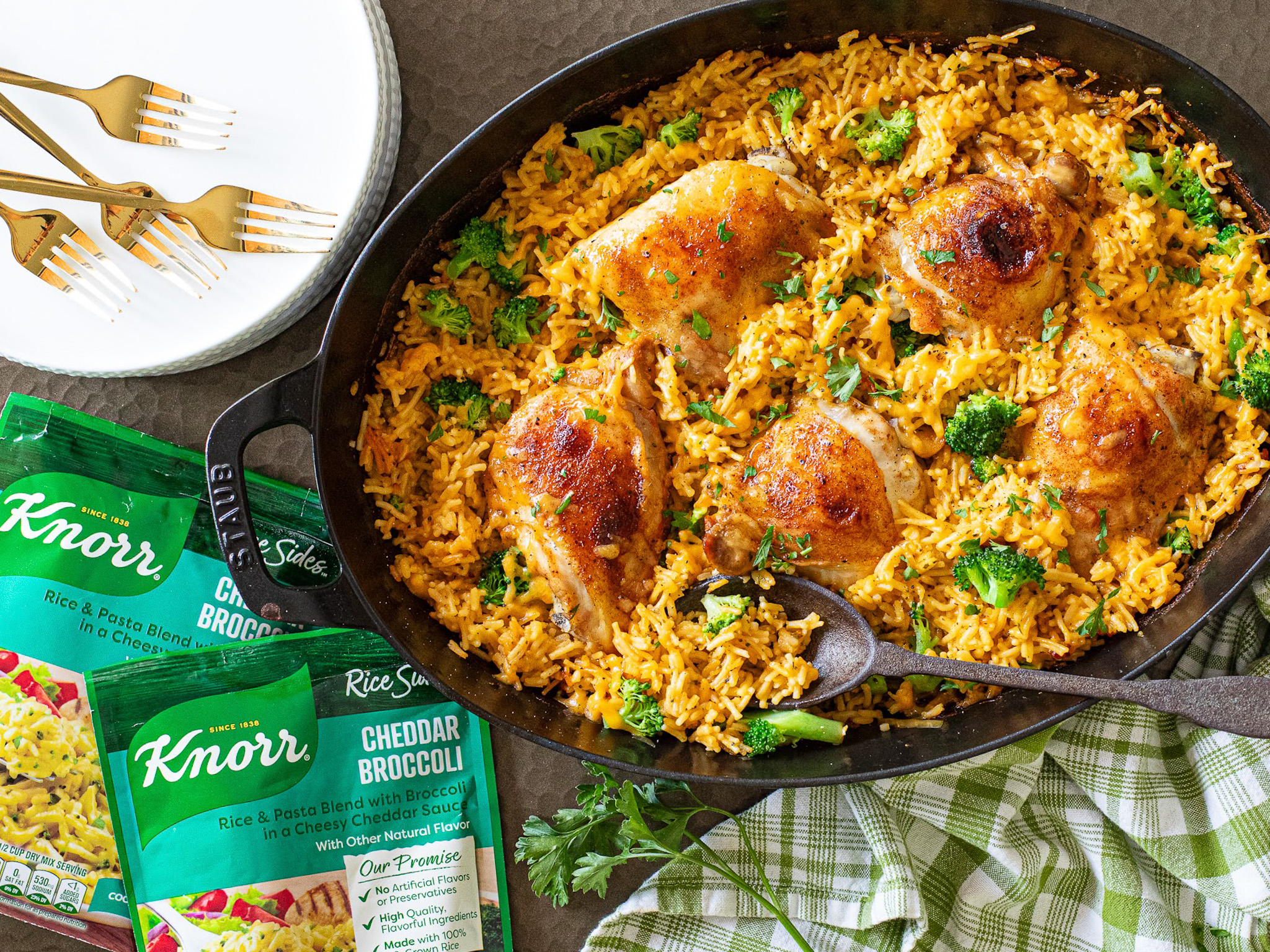 - Mix the Knorr® Rice Sides™ - Cheddar Broccoli, water, milk, broccoli and 1/4 cup of cheese in a large bowl then pour around the chicken. Bake for an additional 20 minutes.
