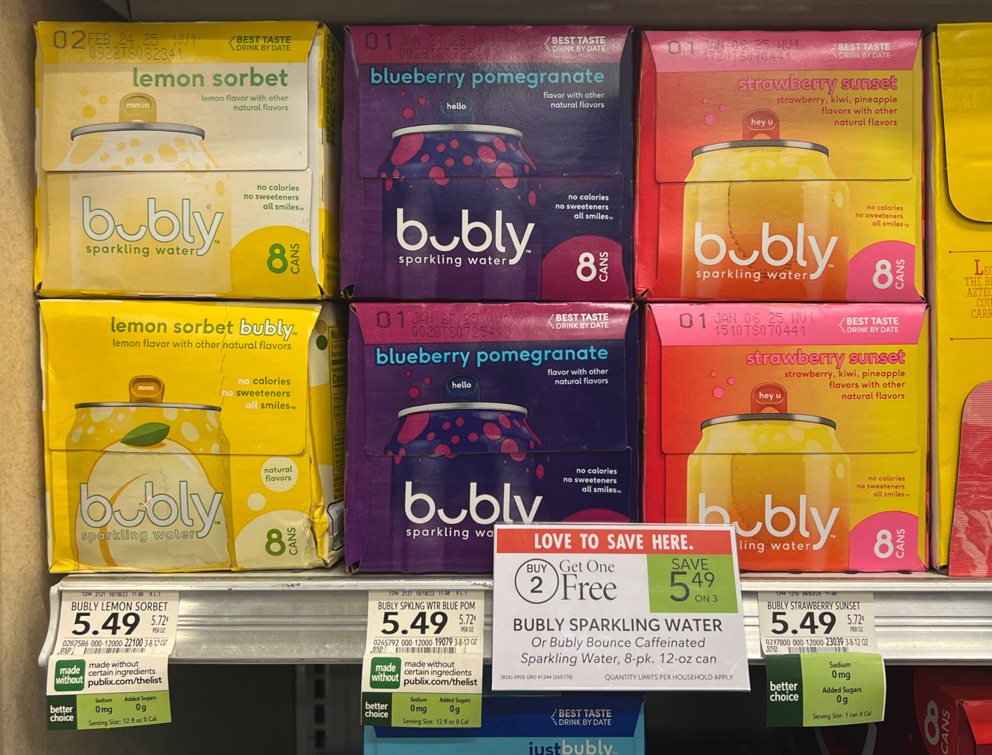 Bubly Sparkling Water, or Bubly Bounce Caffeinated Sparkling Water, 8-pk, 12 oz can, B2G1 $5.49