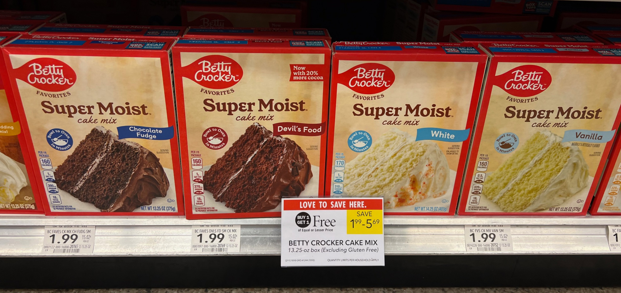 Betty Crocker Cake Mix, 13.25 oz; or Brownie, 13.6 to 19.1 oz, Cookie, 11.9 to 17.9 oz, Muffin Mix, 13.9 to 16.9 oz, or (Excluding Gluten Free), BOGO $1.99 – $5.69