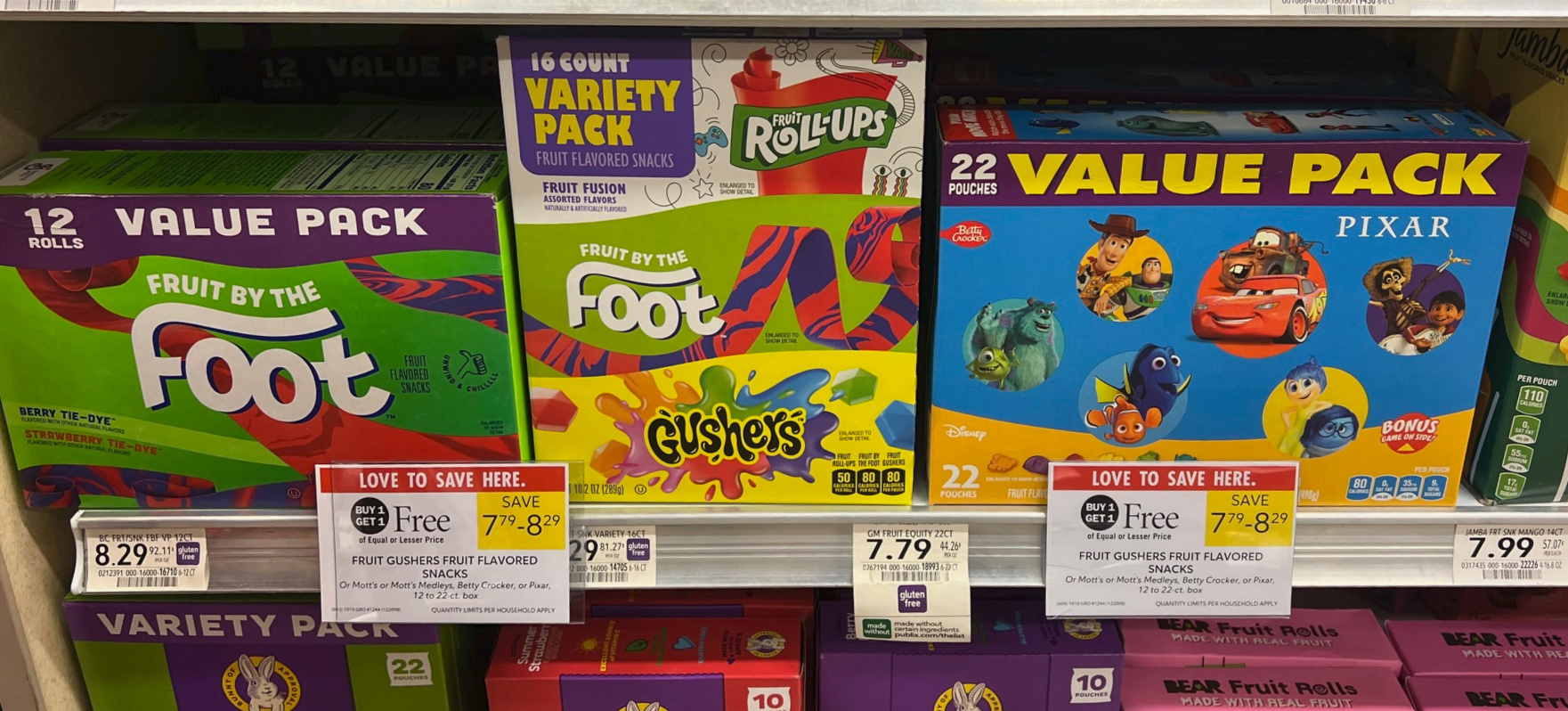 Fruit Gushers Fruit Flavored Snacks, or Mott’s, or Mott’s Medleys, Betty Crocker, Pixar, or Jamba, 12 to 22 ct, or 16.8 oz box, BOGO $7.79 – $8.29