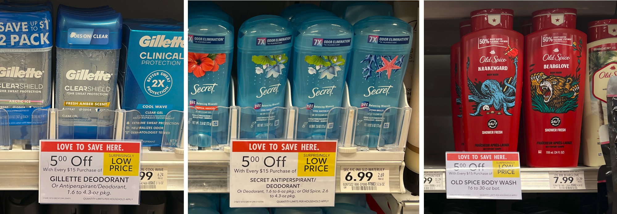 –$5/3 Secret, Old Spice or Gillette Deodorant/Spray 1.6-7.6 oz, Olay Bar Soap 6 ct and/or Old Spice or Olay Body Wash or Lotion 16-30 oz (excludes PH Balance & High Endurance/Classic Deodorant, Secret Whole Body, Old Spice Total Body and trial/travel size) (Publix Digital Coupon)