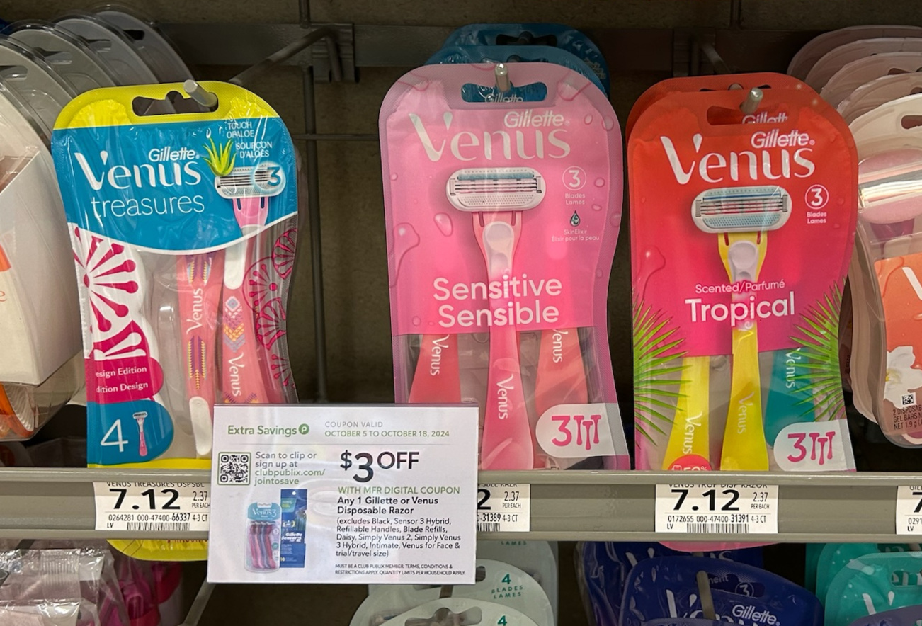–$3/1 Venus Disposable Razor (excludes Daisy, Simply Venus 2, Venus Refillable Handles, Venus Blade Refills, and Gillette Products) (Publix Digital Coupon) – EXP 10/19