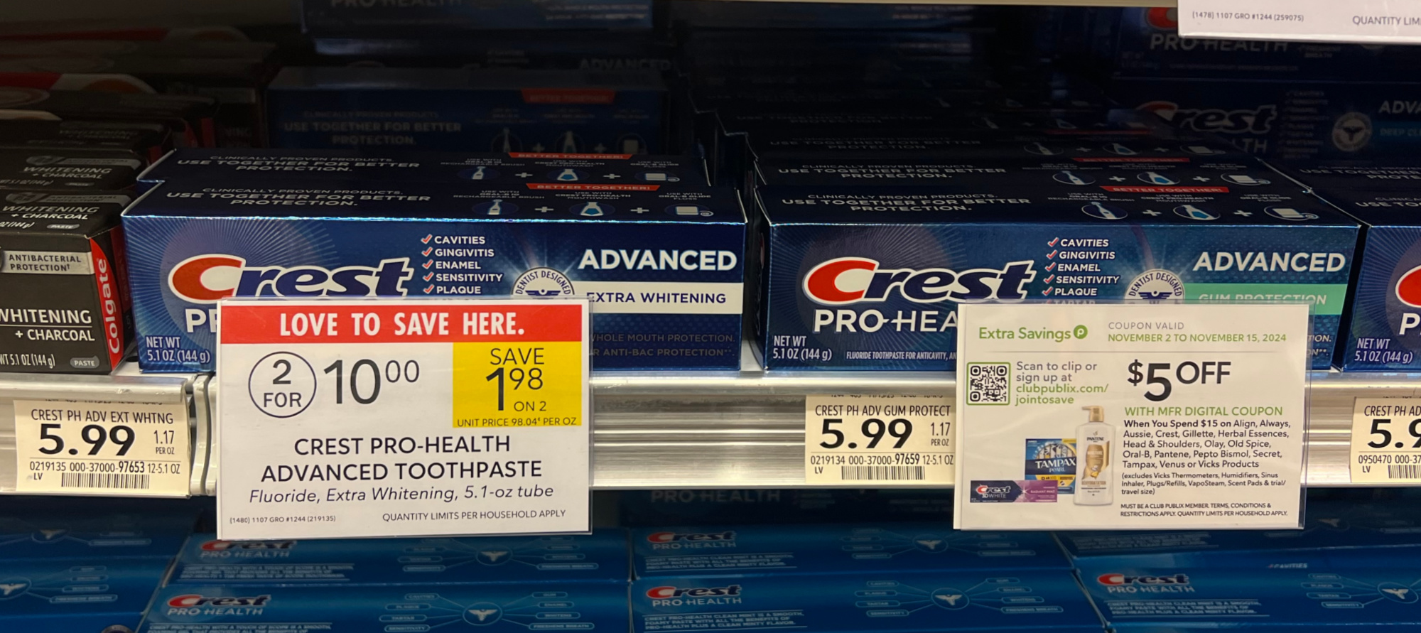 –$2/1 Crest Toothpaste 2.4 oz or more (excludes Crest Cavity Protection, Baking Soda, Tartar Control/Protection, Brilliance, Gum, Densify, Aligner Care, Kids, More Free packs, and trial/travel size) (Publix Digital Coupon)