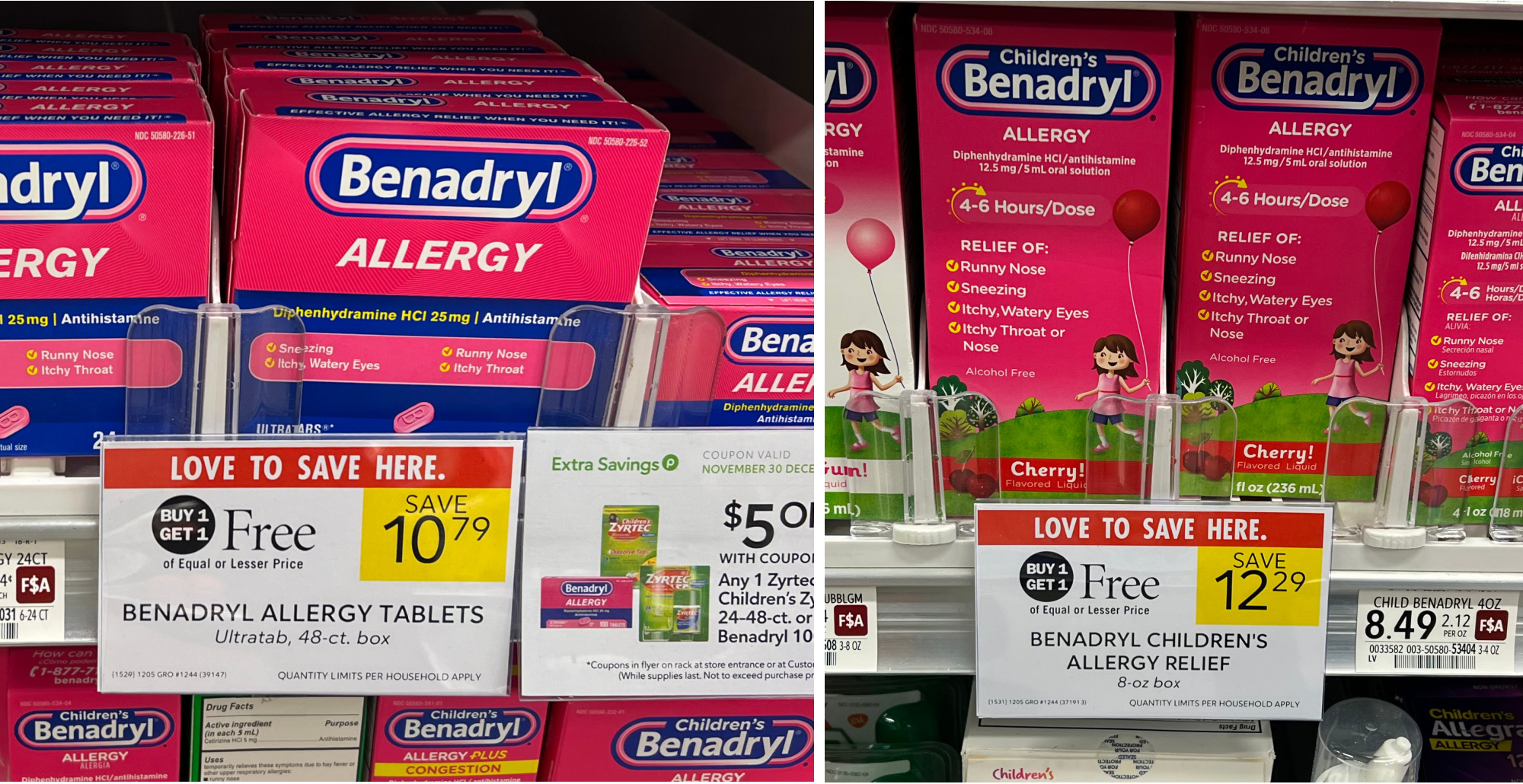 Benadryl Allergy Medicine, or Children’s Benadryl, 48 ct, or 8 oz, BOGO $10.79 – $12.89