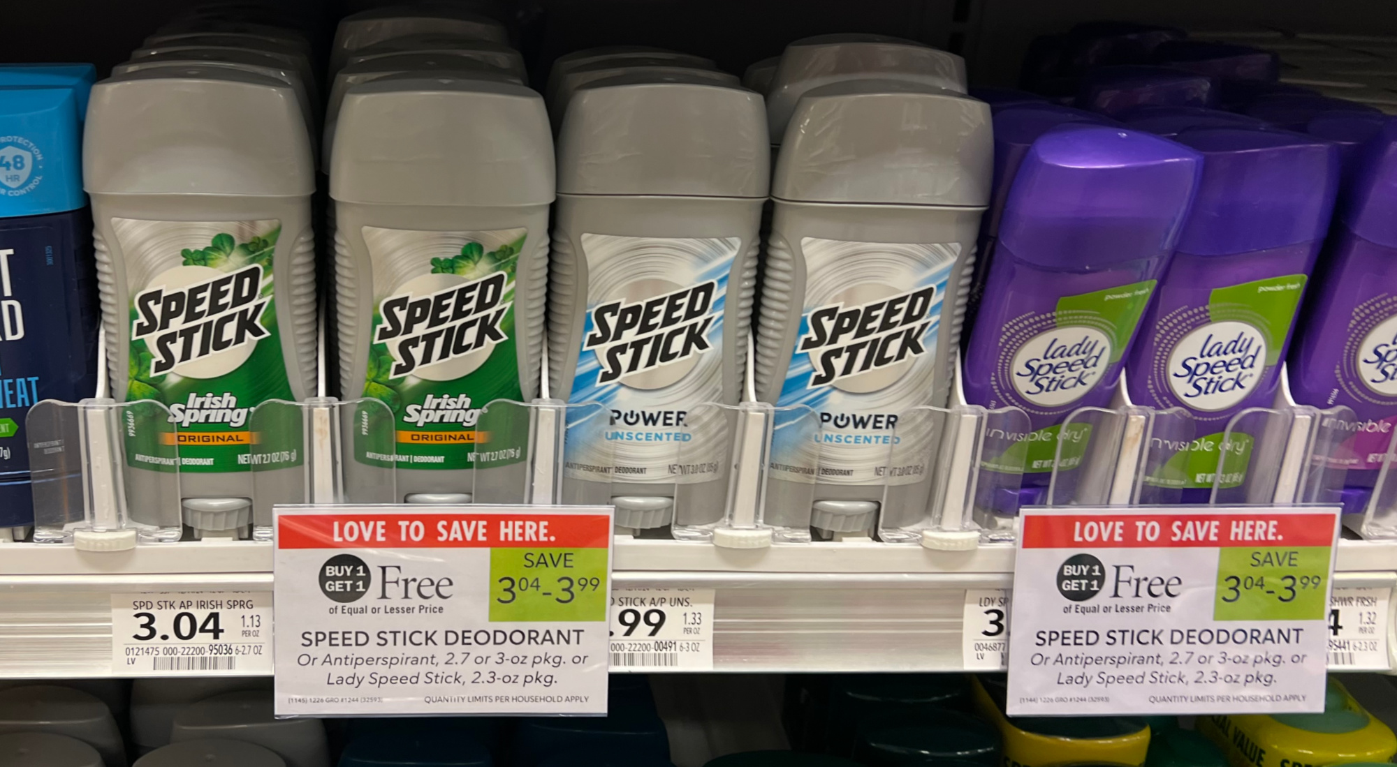 Speed Stick Deodorant, or Antiperspirant, 2.7 or 3 oz, or Lady Speed Stick, 2.3 oz, BOGO $3.04 – $3.99