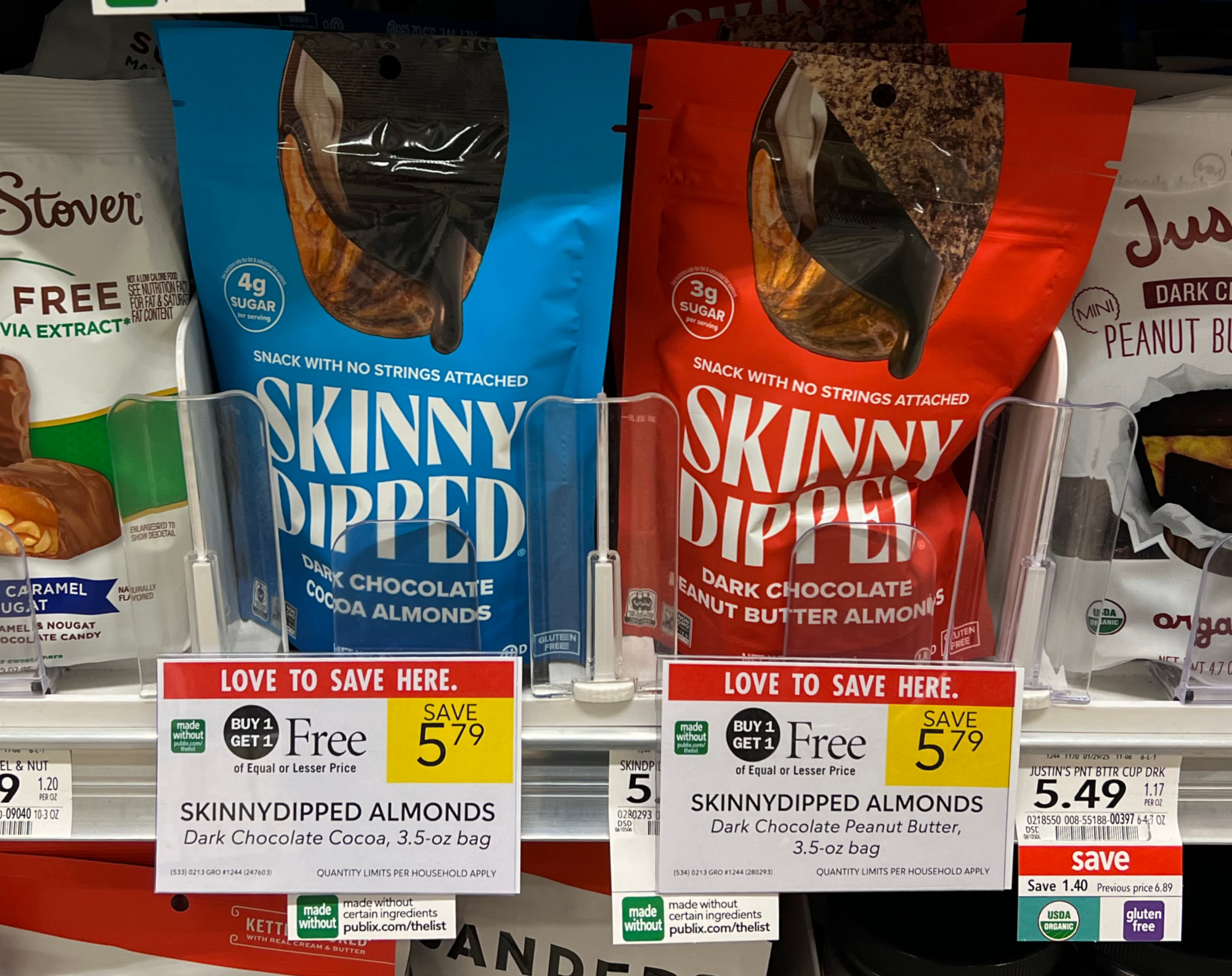 Right now the bags of Skinny Dipped Almonds are BOGO at Publix. Add in the cash back offer and you pay just $2.15 per bag.