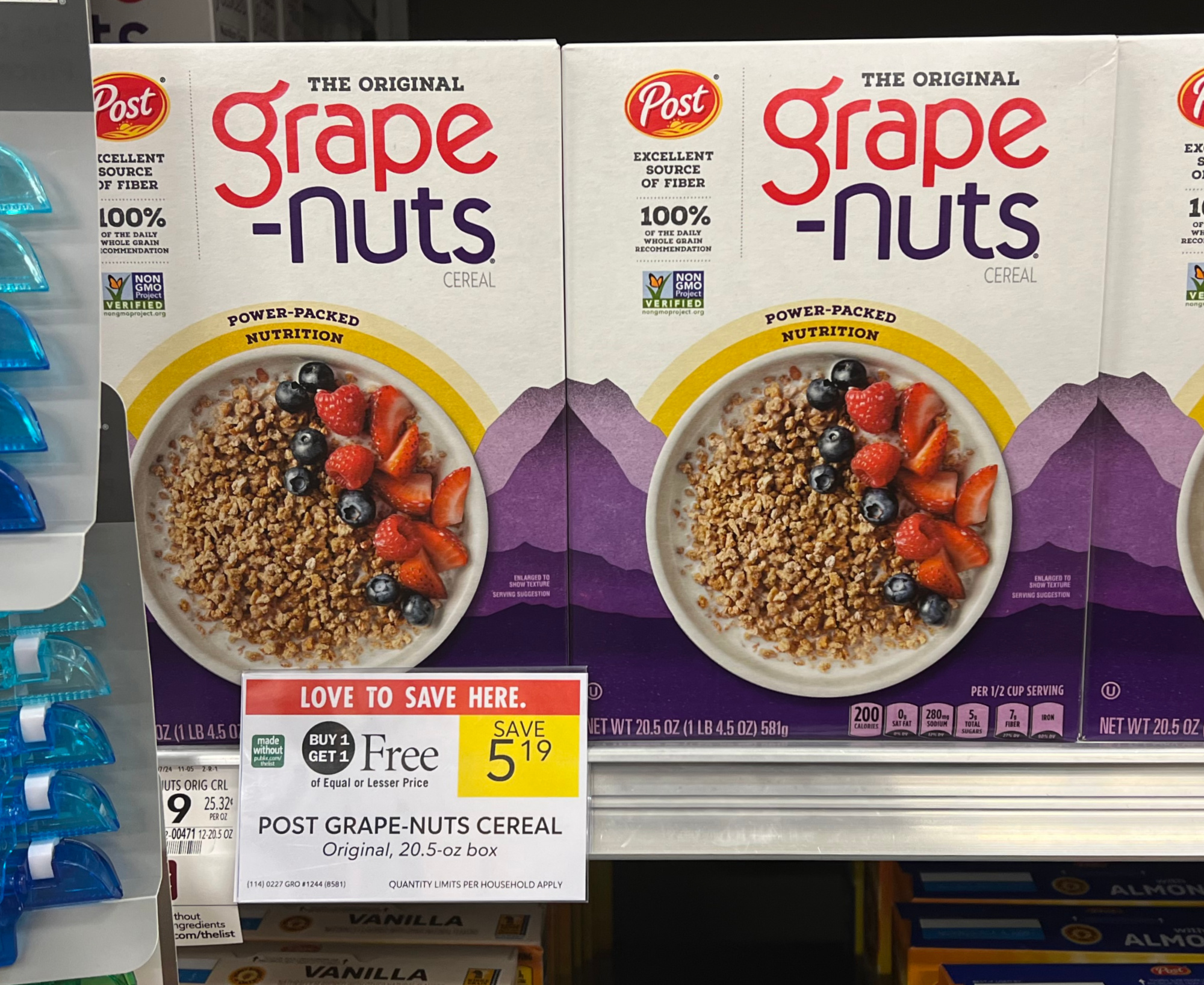 Combine the new cash back offer and BOGO sale to get Post Grape-Nuts Cereal for as little as $1.60 per box.