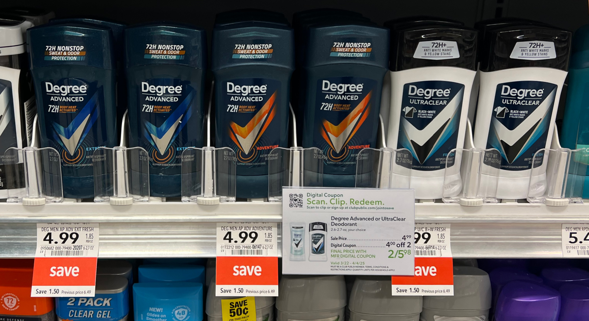 –$4/2 Degree Body Heat Activated or Ultraclear Antiperspirant Stick or Dry Spray or Degree Clinical Protection Deodorant or Whole Body Deodorant product (excludes twin packs, 0.5oz, 1.0oz sizes) (Publix Digital Coupon)
