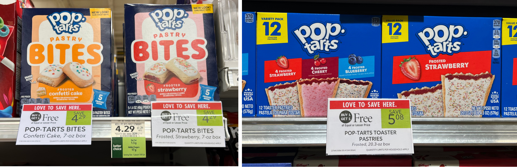 Look for Kellogg’s Pop-Tarts and Pop-Tarts Bites on sale with a matching coupon. Get a couple of your favorite flavors for as little as $1.65 each the next time you shop.