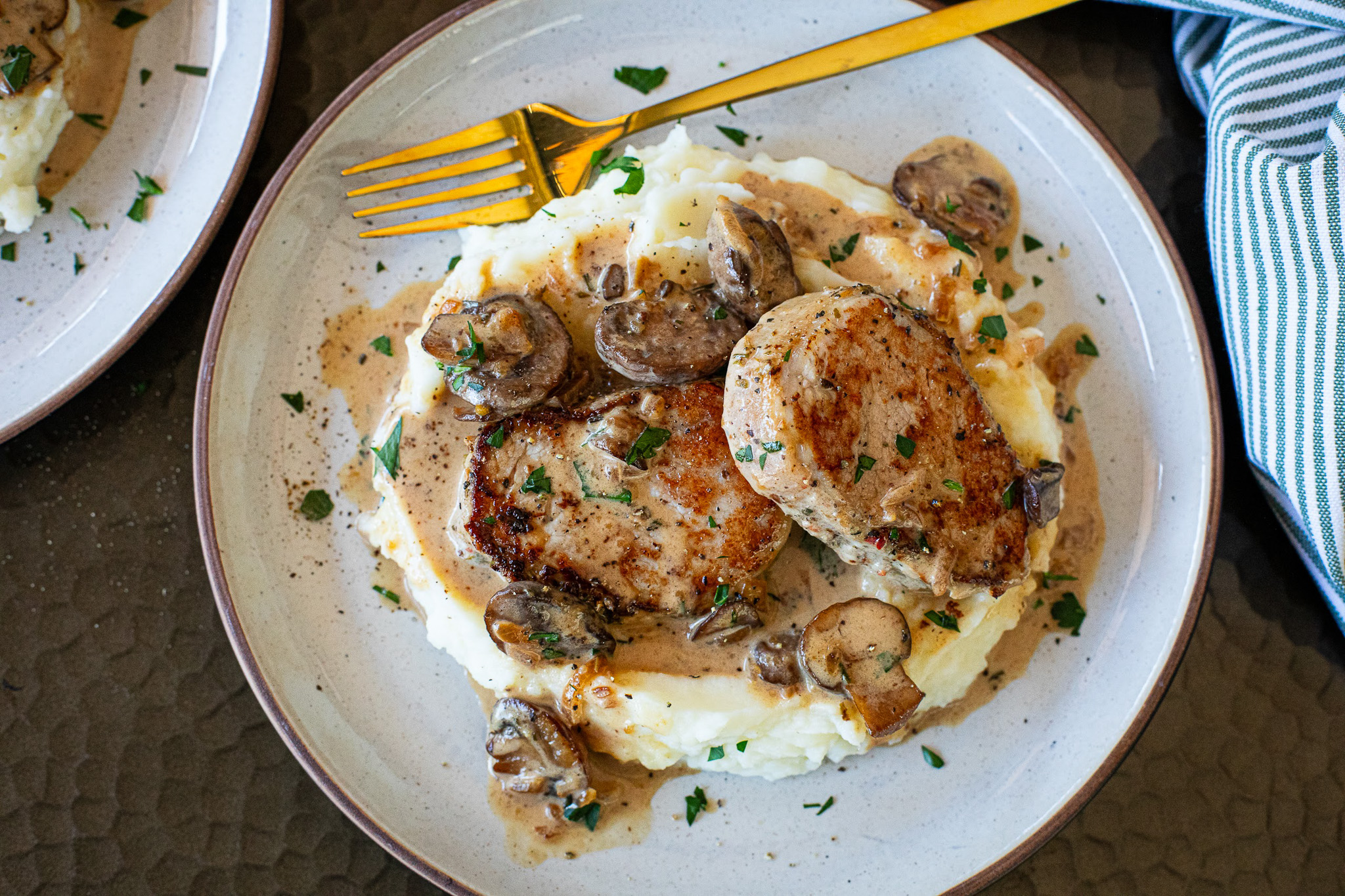 - Flip the pork and cook an additional 3 - 5 minutes, until seared. Remove to a plate and keep warm. NOTE: The pork will finish cooking in the sauce.