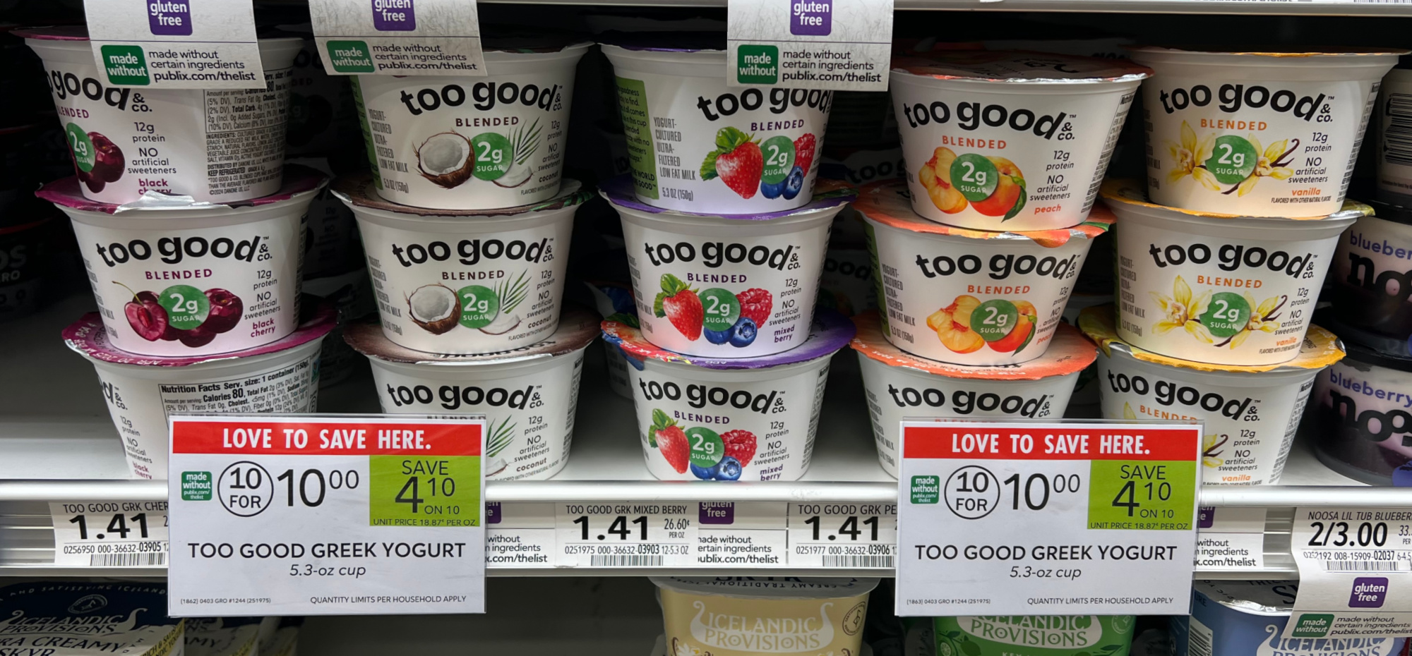We have a Too Good Greek Lowfat Yogurt cash back offer that goes with the new Publix sale. Pick up your favorite flavors for 50¢ after discounts!