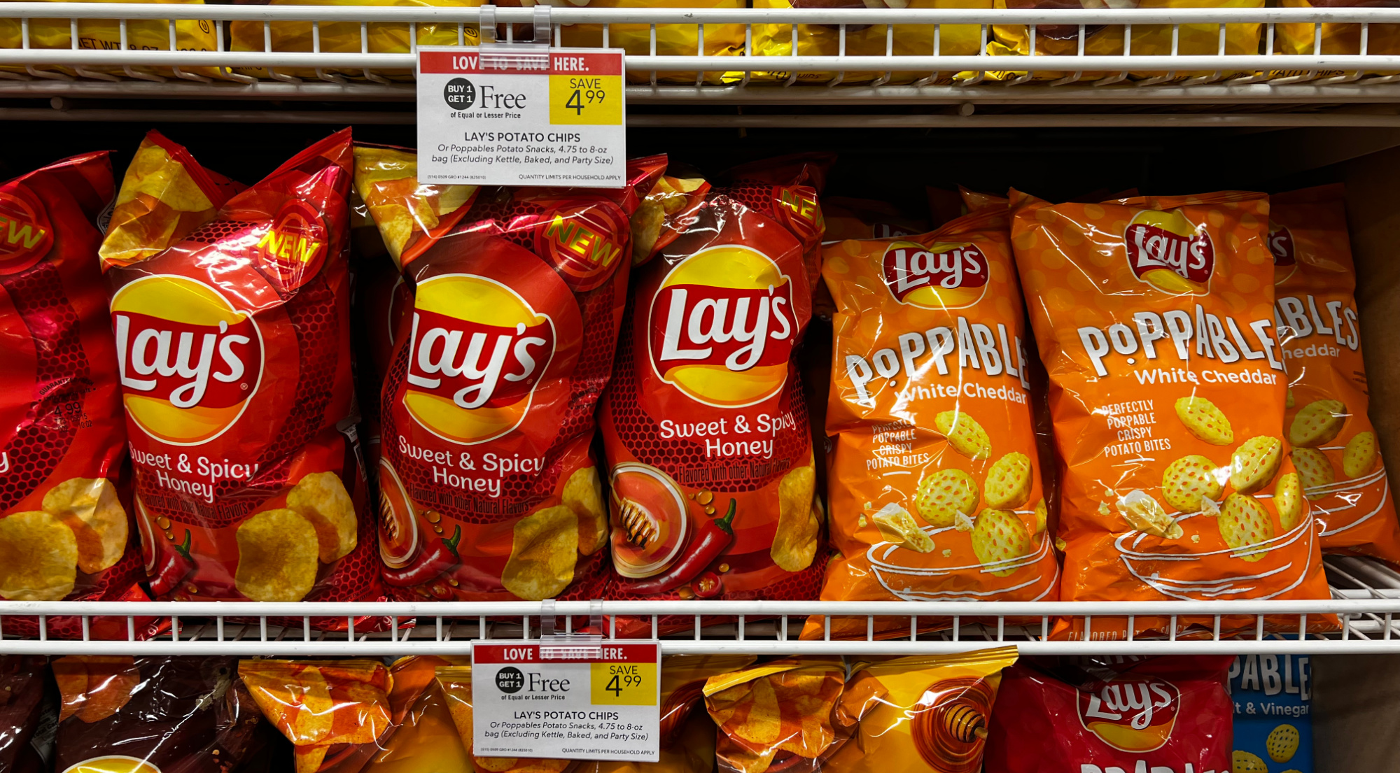 Lay’s Potato Chips, or Poppables Snacks, or Kettle Cooked, 4.75 to 8 oz bag, (Excluding Baked Simply, and Party Size), BOGO $4.99