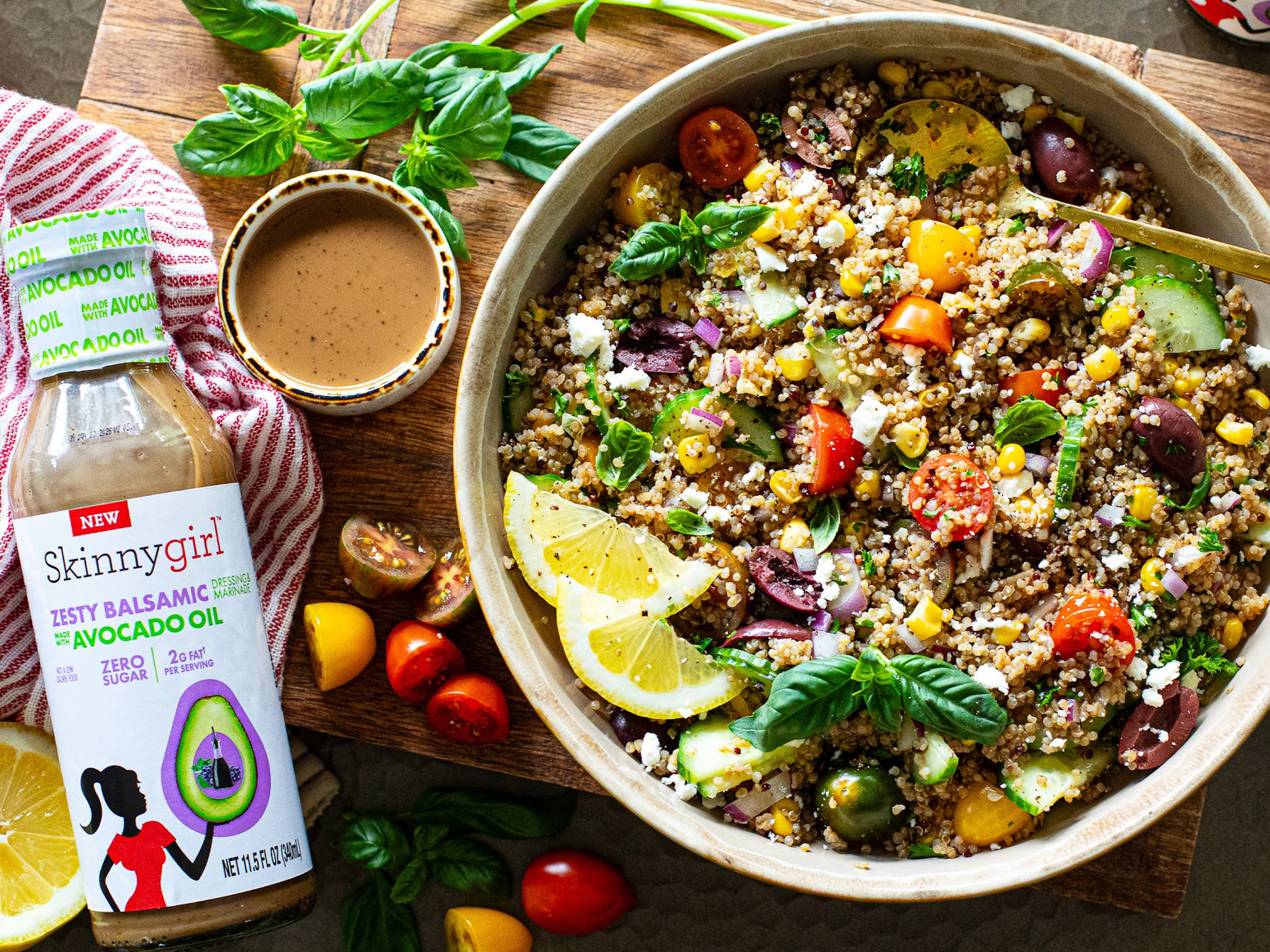 - Combine quinoa, corn, olive, cucumber, red onion and Skinnygirl Zesty Balsamic Avocado Oil Dressing in a large bowl and toss to combine.