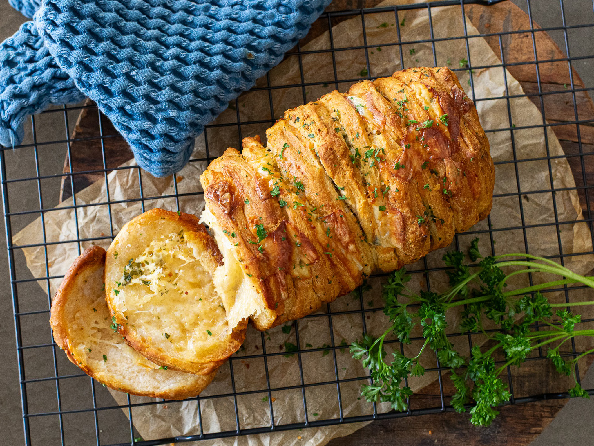 - Dip a dough piece into the butter mixture and top with a quarter slice of the Gayo Azul Gouda Cheese. Continue with the remaining dough, stacking them on top of each other to create two stacks of 8 dough pieces.
