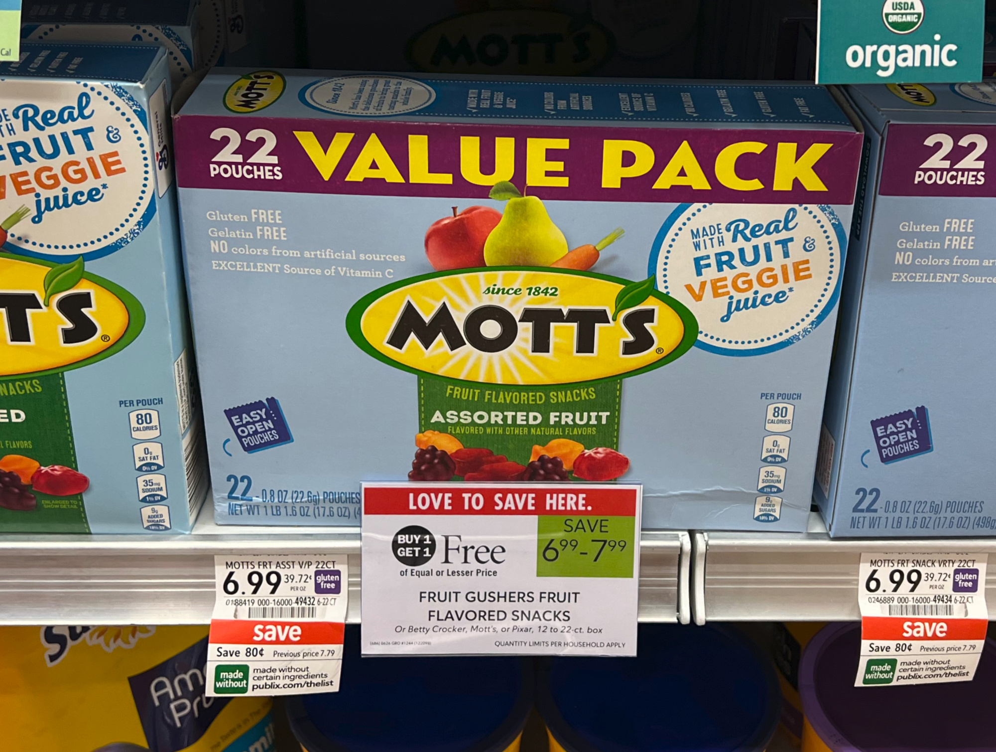–$1/2 Betty Crocker Fruit Shapes (10-22CT), Fruit by the Foot (6-12CT), Gushers (6-12CT), Fruit Roll-Ups (10-20CT) OR Mott’s Fruit Flavored Snacks (8-22CT) (Publix Digital Coupon)