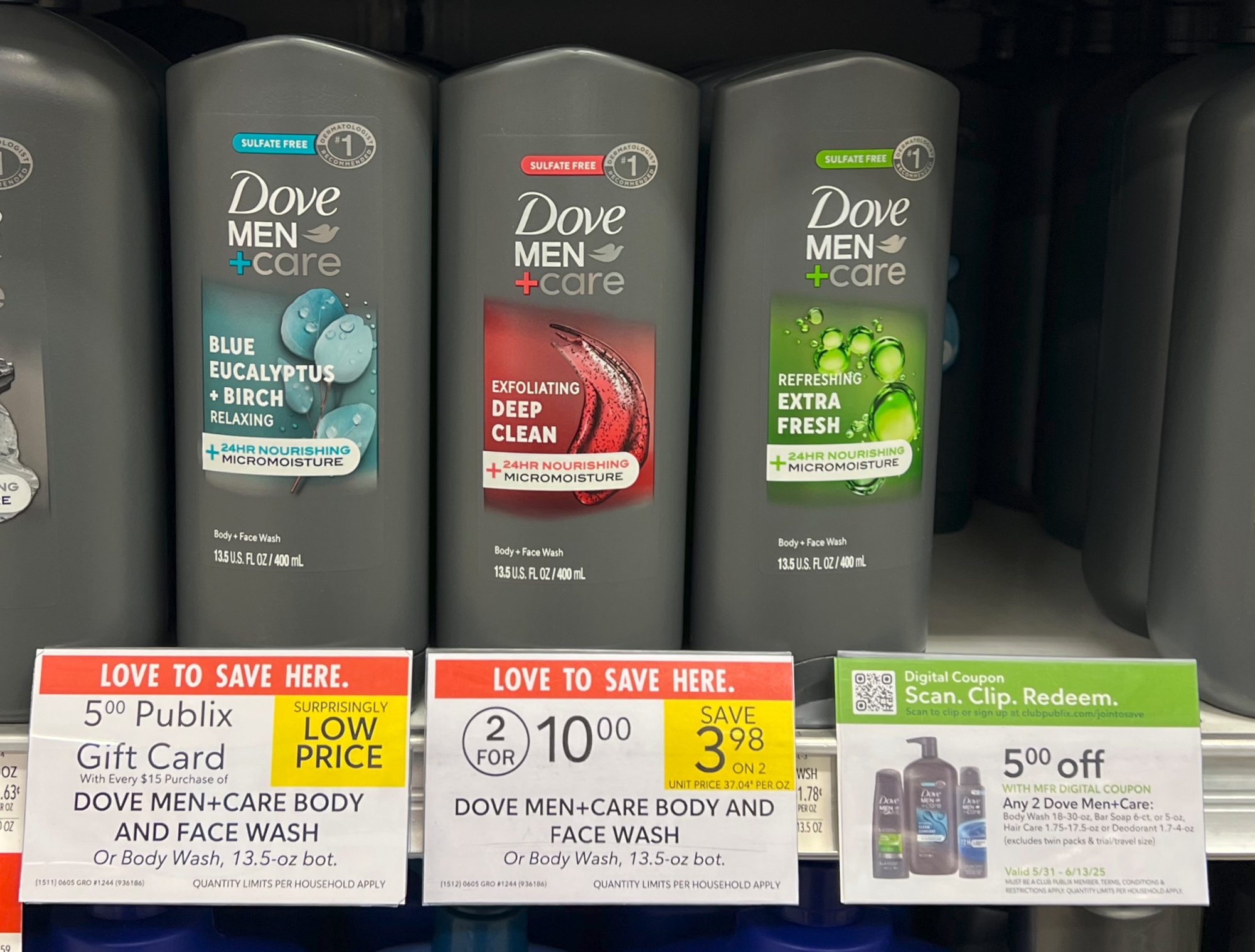 –$5/2 Dove Men+Care products including Body Wash (18oz+) & Plant-Based Body Wash (18oz+), Bar 4ct+ & Plant-Based Cleansing Bar (1ct 5oz), Body & Face Scrubs (9oz only), Hair, Antiperspirant and Deodorant (Sticks, Sprays) (Includes Twin Packs; Excludes Whole Body deodorant, trial & travel) (Publix Digital Coupon)