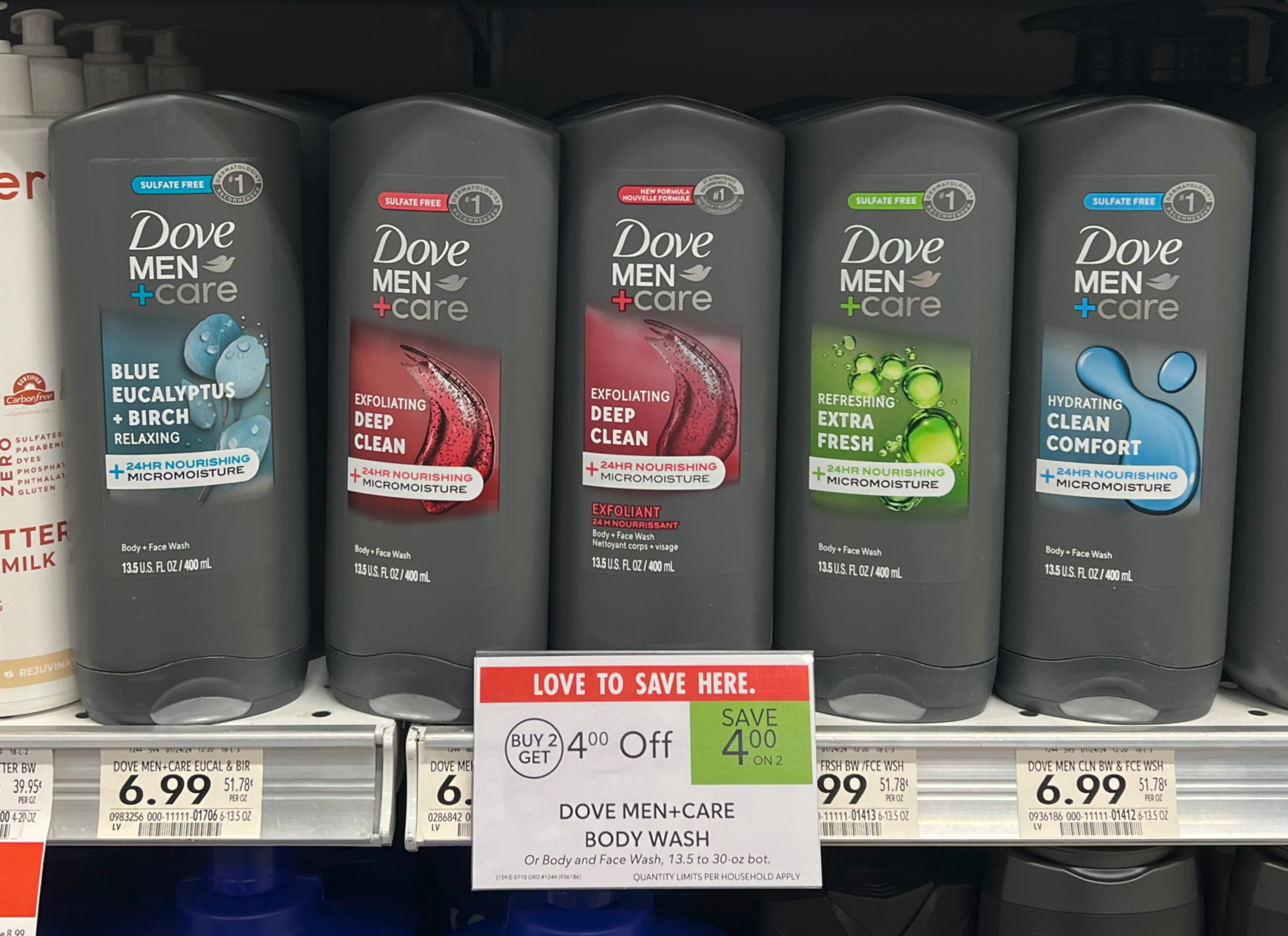 –$3/1 Dove Body Wash (20oz+), Dove Men+Care Body Wash (18oz+), Cleansing Bar (4ct+), Dove Scrubs (15oz only) (Excludes Dove Men+Care Body Wash 26oz, all other items and sizes not listed, and trial & travel) (Publix Digital Coupon)