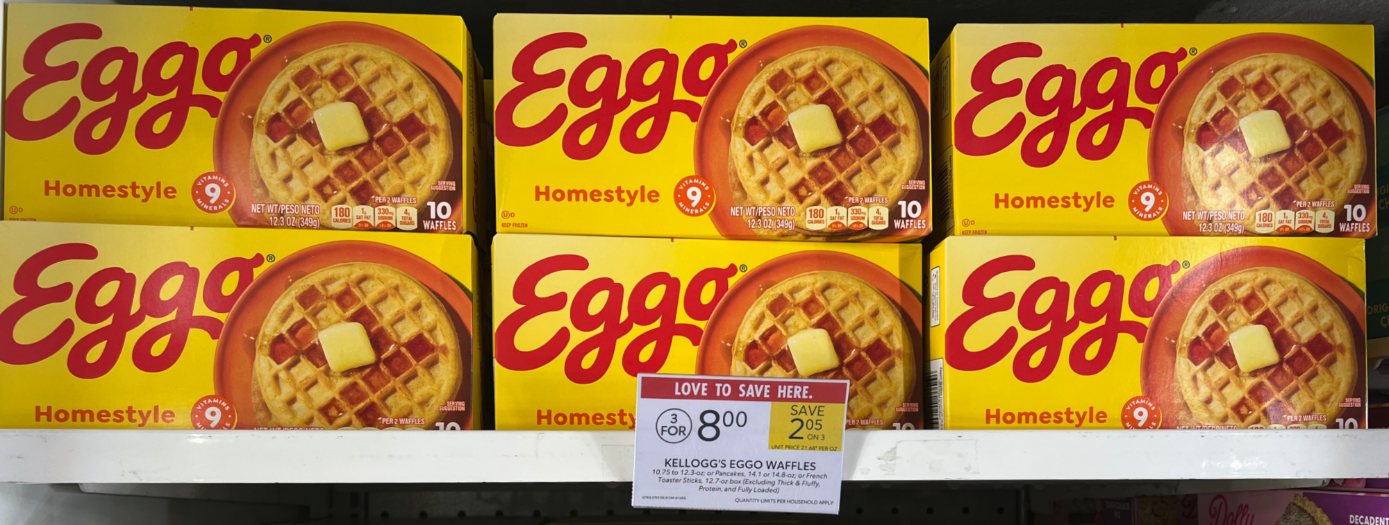 Kellogg’s Eggo Waffles, 10.75 to 12.3 oz; Pancakes, 14.1 or 14.8 oz; or French Toaster Sticks, 12.7 oz box, (Excluding Thick & Fluffy, Protein, and Fully Loaded), 3/$8 (reg $3.35)