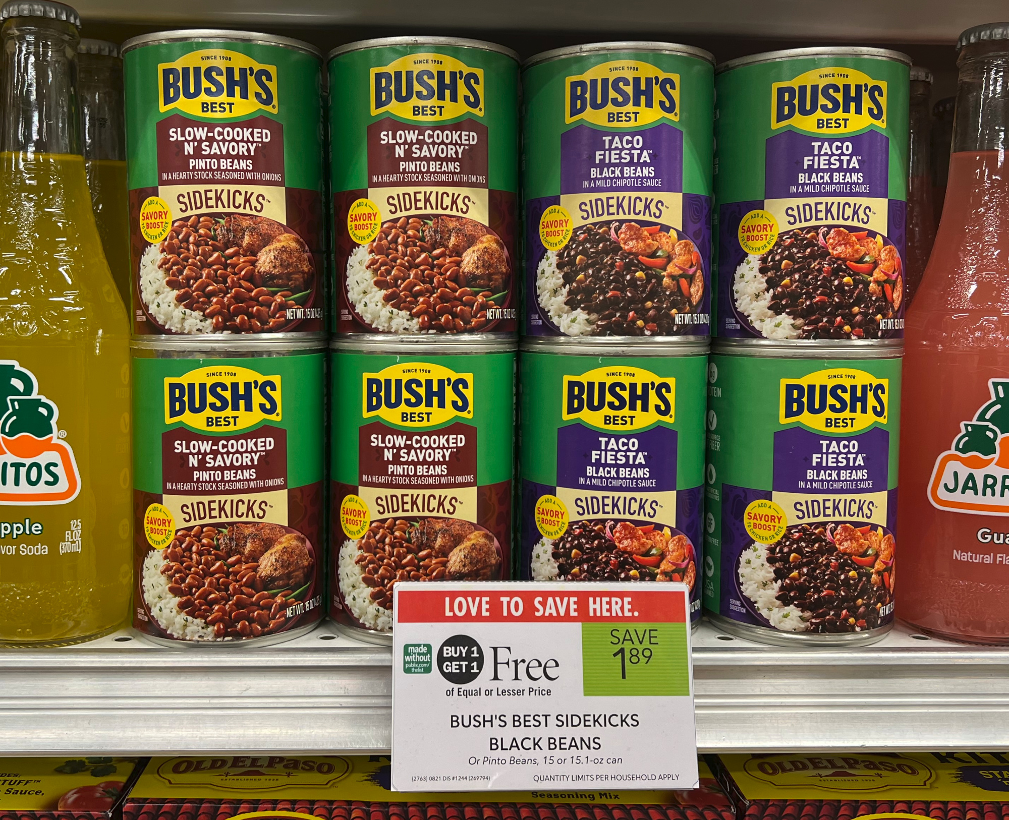 Bush’s Best Sidekicks Black Beans, or Pinto Beans, 15 or 15.1 oz can, BOGO $1.89