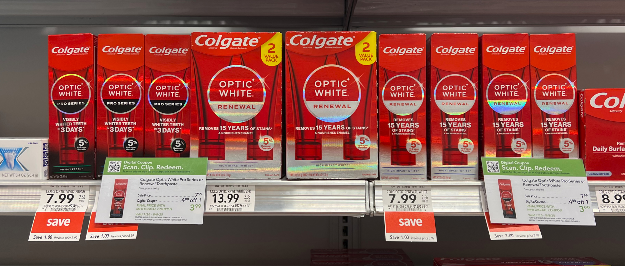 You can get a fantastic deal on Colgate Optic White Renewal or Pro Series Toothpaste right now. By combining the sale with a digital coupon, you can get a tube for as little as $3.99. Much better than the regular price of $8.99 per tube!
