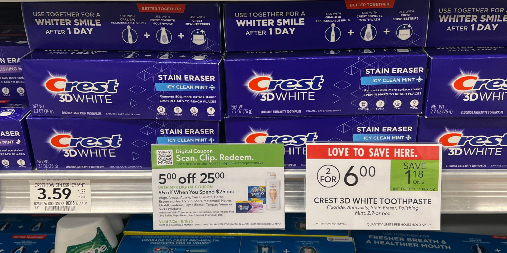 –$1/1 Crest Toothpaste 2.4 oz or more (excludes Crest Cavity, Baking Soda, Tartar Control/Protection, Brilliance, Gum, Densify, Aligner Care, Kids, More Free packs, and trial/travel size) (Publix Digital Coupon)
