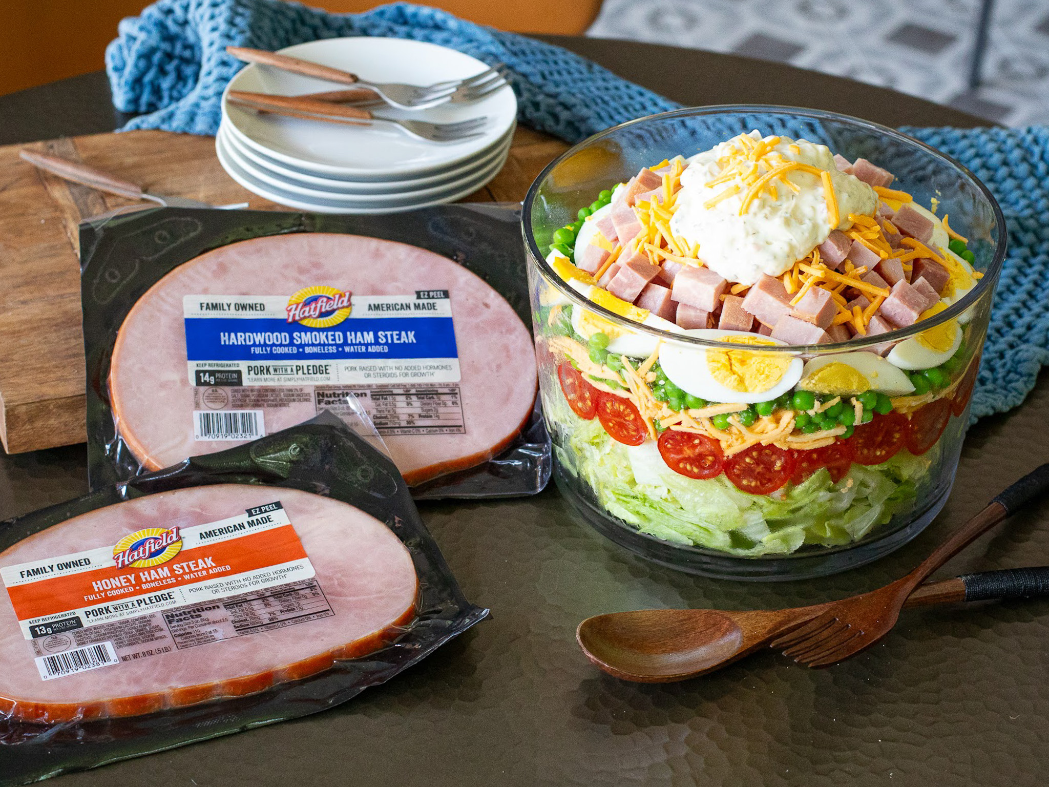 A 7-Layer Salad is always a hit at gatherings. It’s visually appealing and can be assembled ahead of time, making it a stress-free addition to any menu. To shake things up I like to use cubed Hatfield Ham Steak in place of the bacon. You get great flavor, and it adds a little extra something special to every bite.