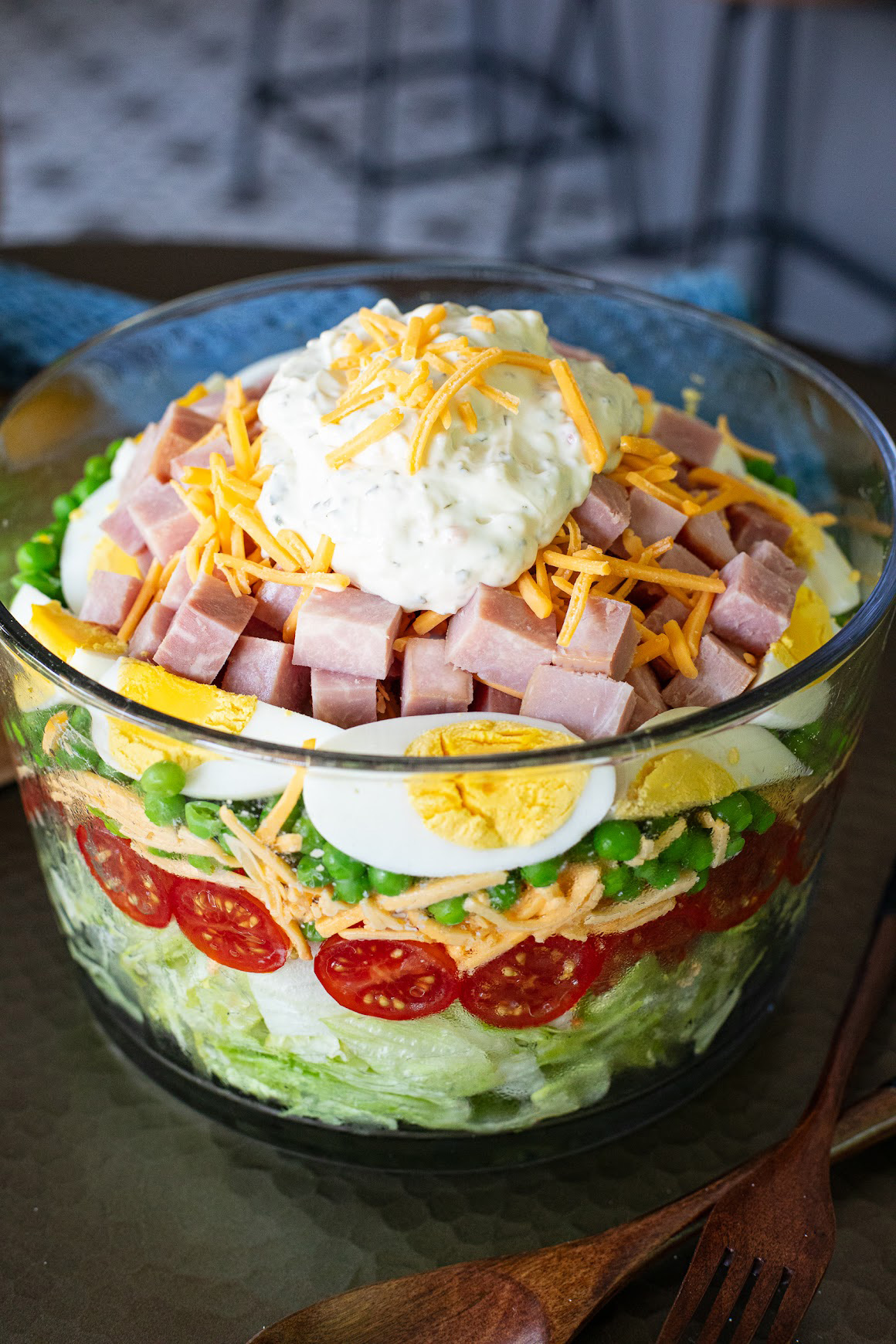 - In a trifle dish or large bowl, layer the chopped lettuce, tomatoes, 1/2 of the cheese, thawed frozen green peas, sliced eggs and chopped ham.
