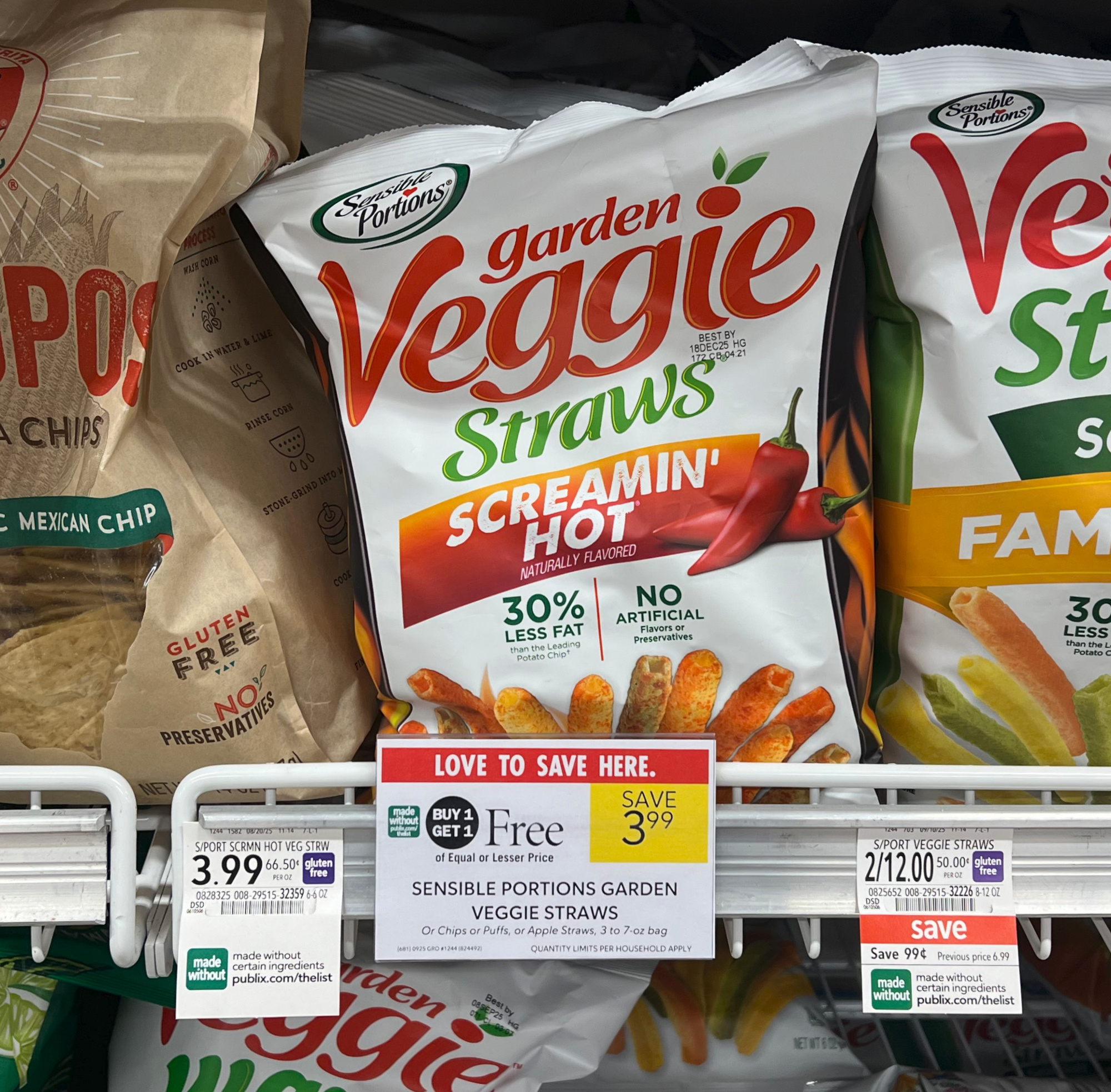 Sensible Portions Garden Veggie Straws, or Chips, or Puffs, or Apple Straws, 3 to 7 oz bag, BOGO $3.29 – $3.99