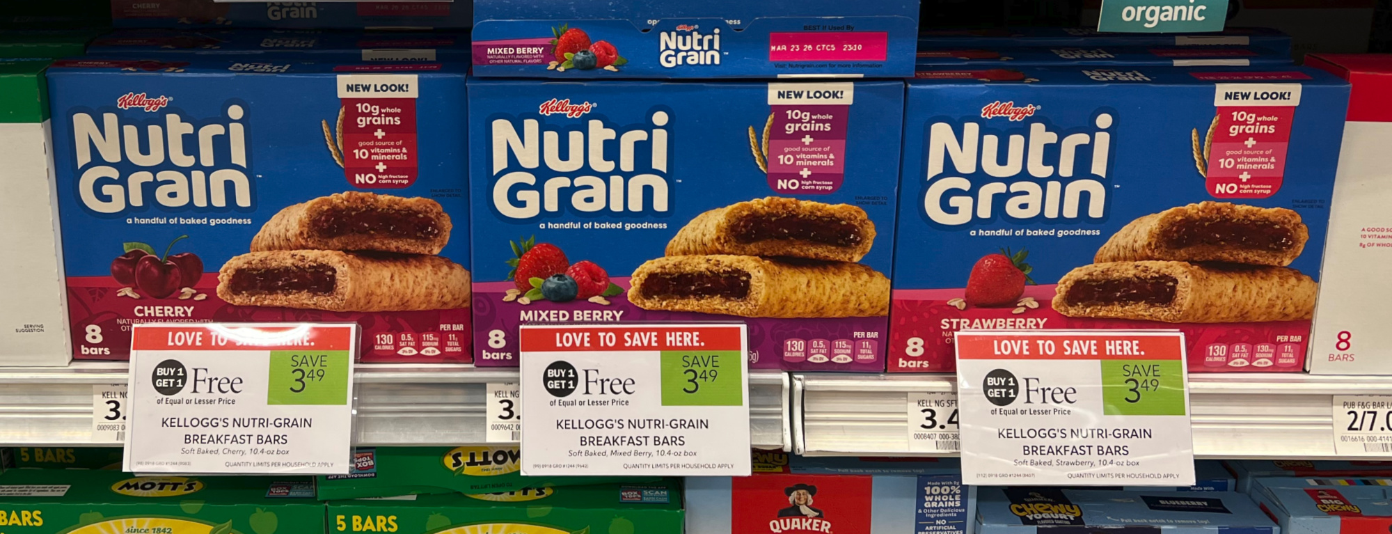With the BOGO sale and coupon combo you can grab a couple of boxes of Nutri-Grain Bars for as little as $1.25 each. That’s about 16¢ per bar.