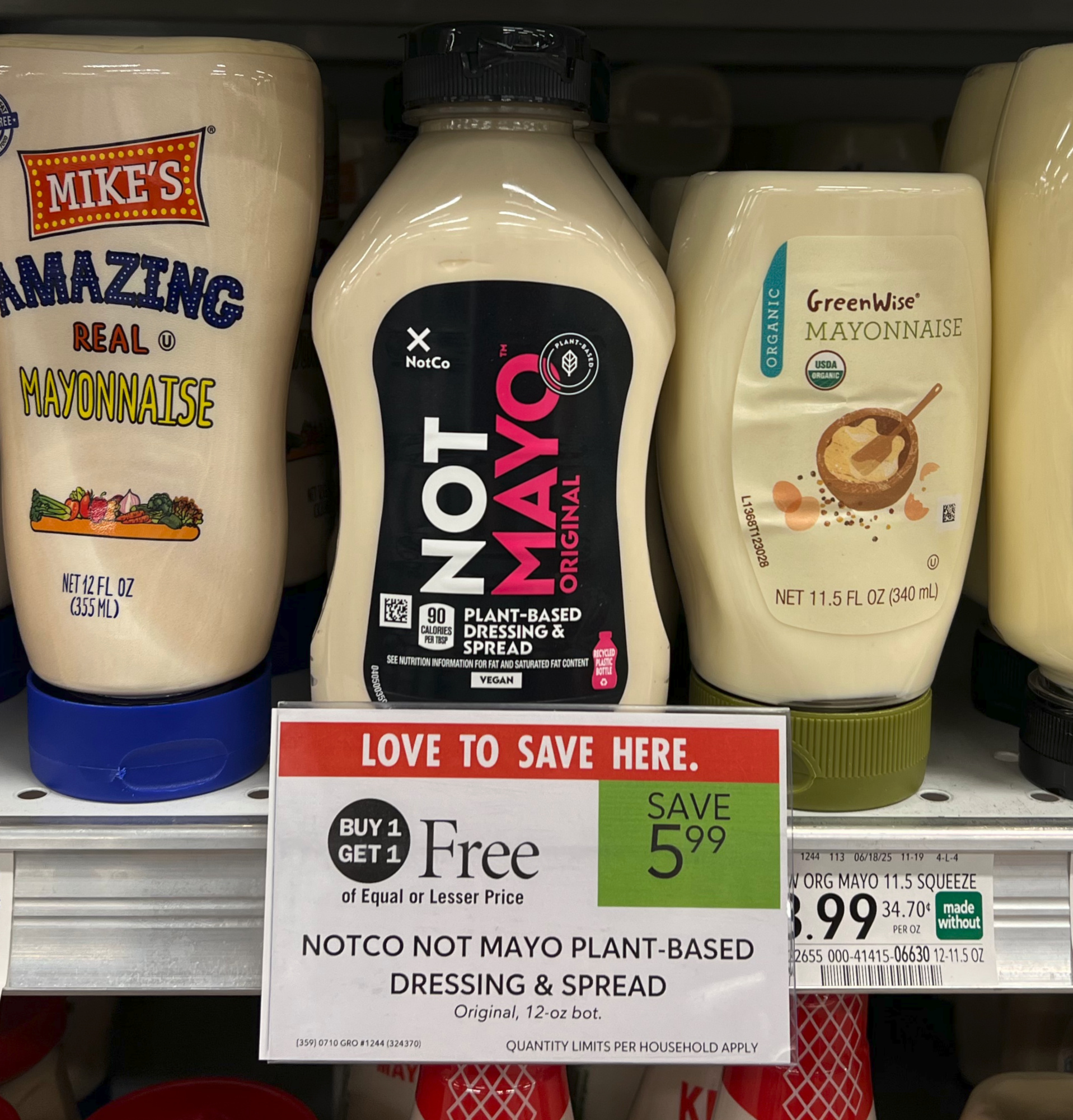 Pick up a nice deal on Notco Not Mayo Plant-Based Dressing & Spread at Publix. Combine the BOGO sale and cash back to pay as little as $1.50 per bottle.