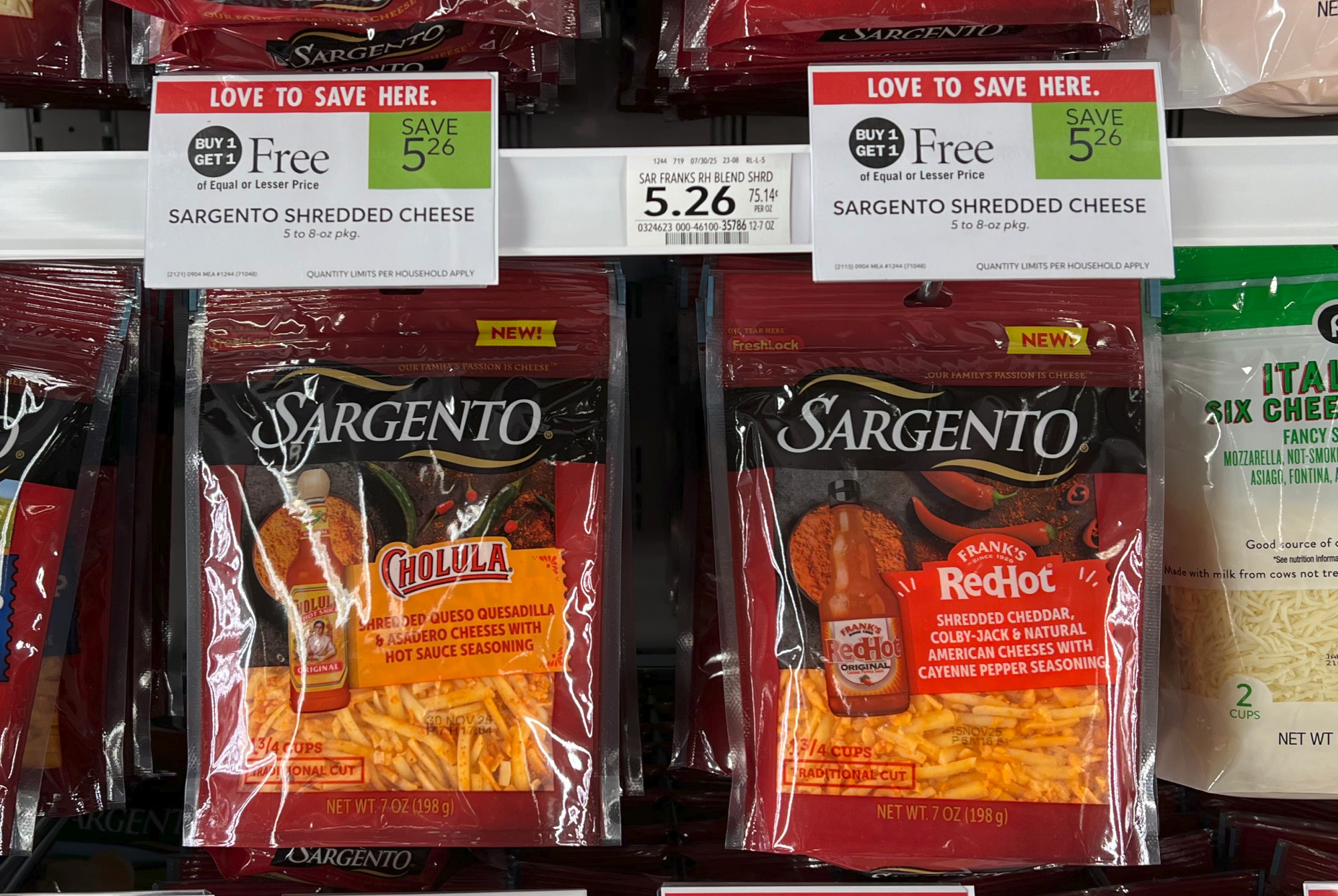Now is a great time pick up some inexpensive Sargento Shredded Cheese. Get the bags of Cholula or RedHot cheese for as little as $2.13 with the sale and coupon. I’ll never pass up cheap cheese!