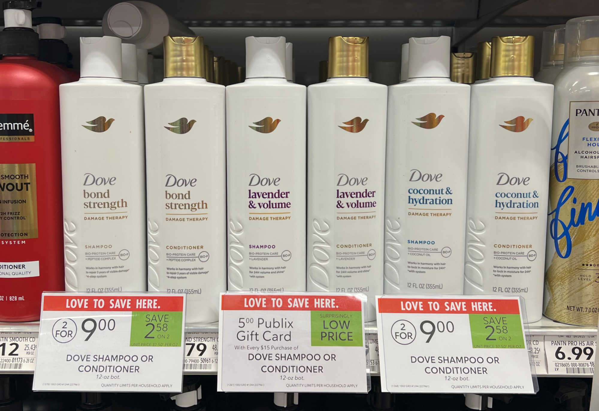 With the combination of the Dove sale, coupon and gift card offer you can pick up hair care items for as little as $2.25 each this week at Publix.