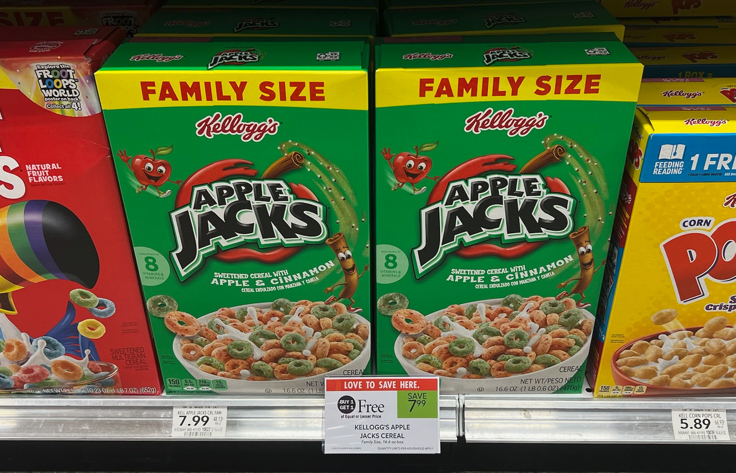 Kellogg’s Frosted Flakes Cereal, Family Size: 21.7 oz, Cocoa Krispies, 19 oz, Rice Krispies, 18 oz, or Apple Jacks, or Froot Loops, 16.6 oz, or Giant Size: Frosted Flakes, 28.5 oz, Corn Flakes, 24 oz, or Frosted Mini-Wheats, 29.5 oz box, BOGO $7.99 – $8.99