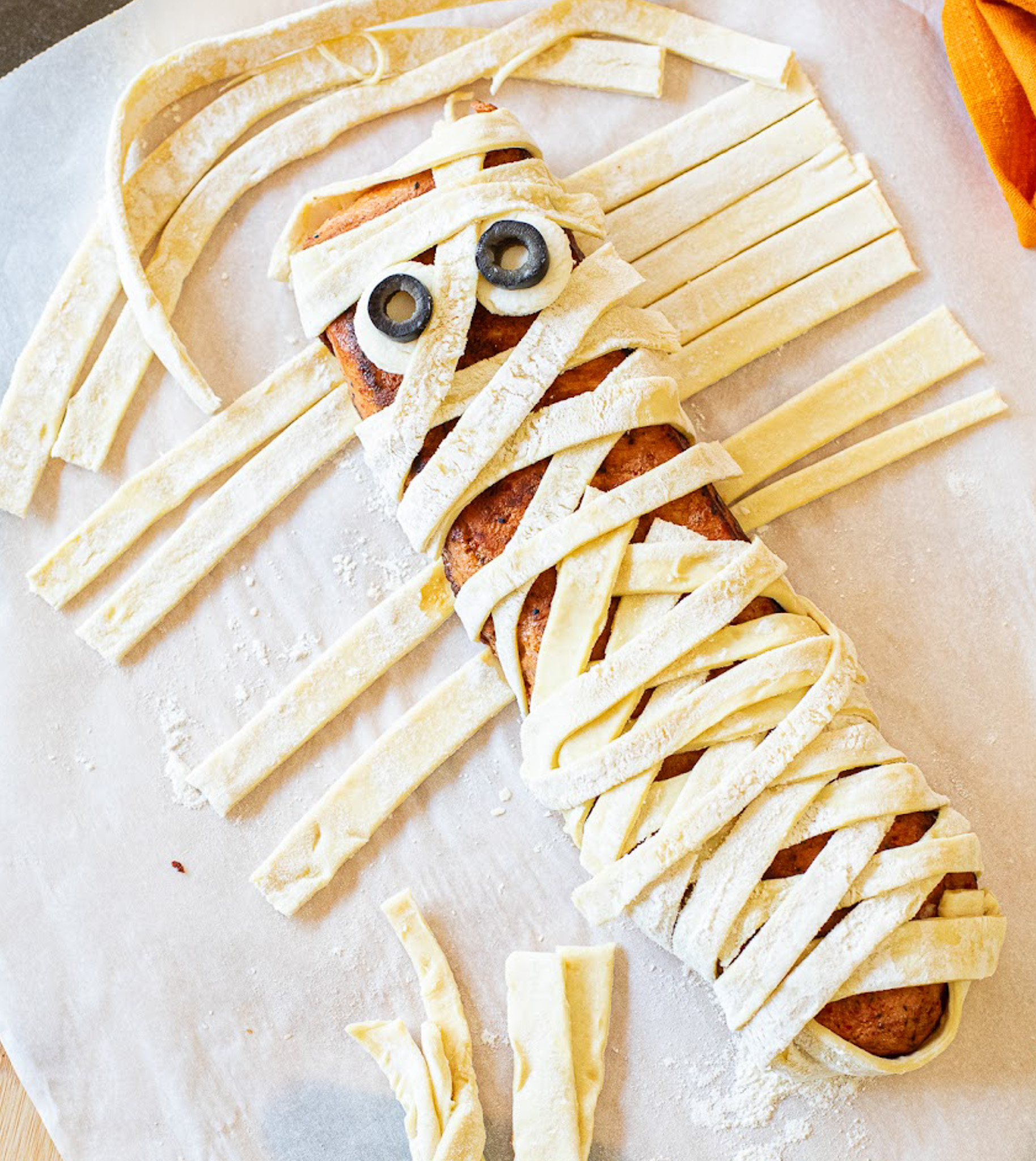 - Take the cooled pork loin and start wrapping the pastry strips around it, just like a mummy's bandages. Leave some small gaps so you can see the pork underneath. Don't worry about being too neat—the messy look adds to the mummy's charm! Make sure to tuck the ends of the pastry strips underneath the pork loin.
