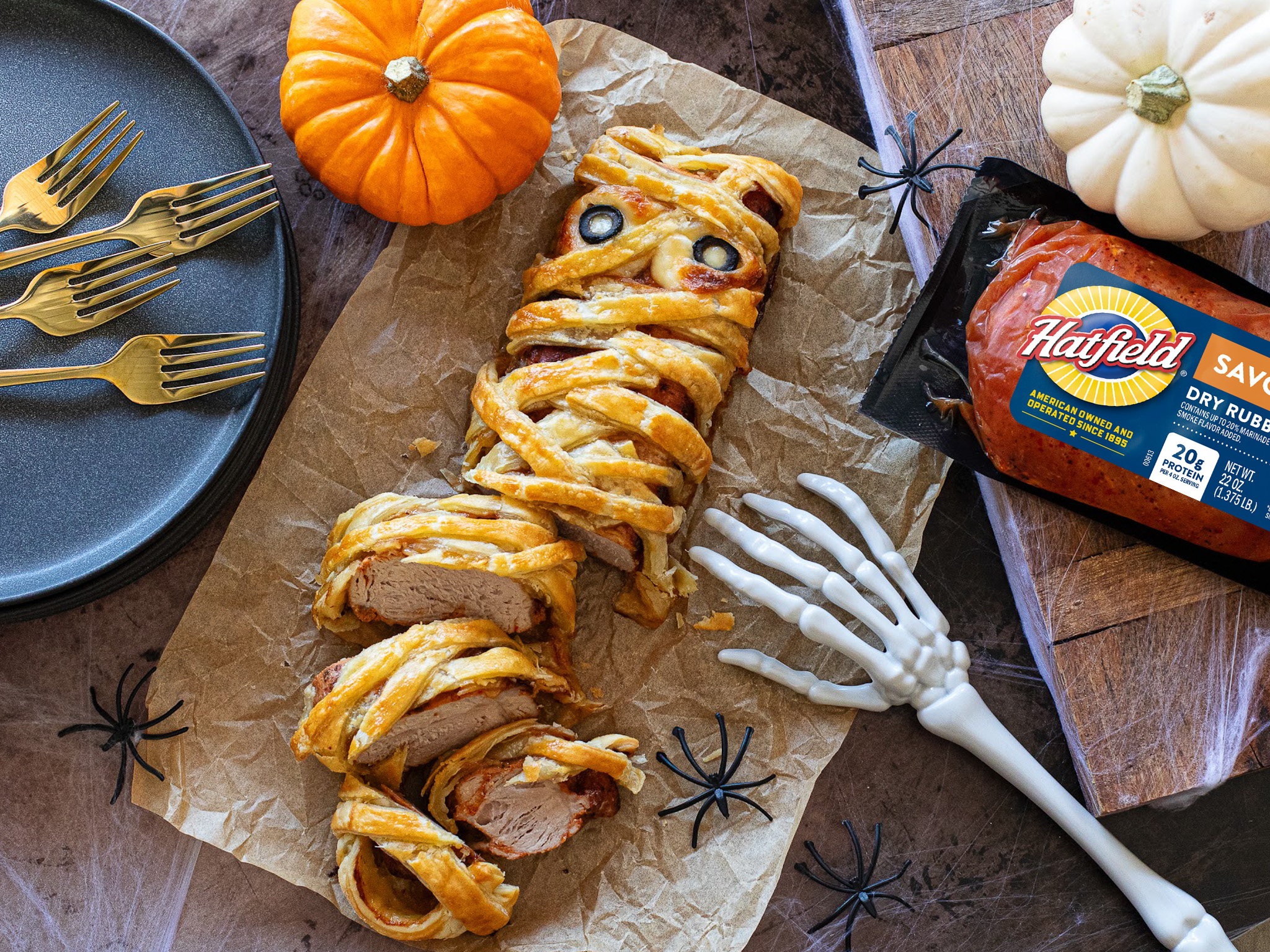 This recipe is as fun to make as it is to eat. The pre-marinated Hatfield pork loin does all the heavy lifting in the flavor department, and the puff pastry provides a wonderfully flaky, golden crust that looks like a spooky mummy wrap.