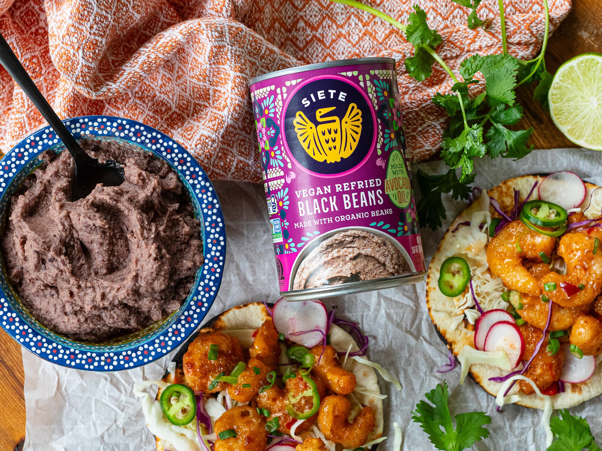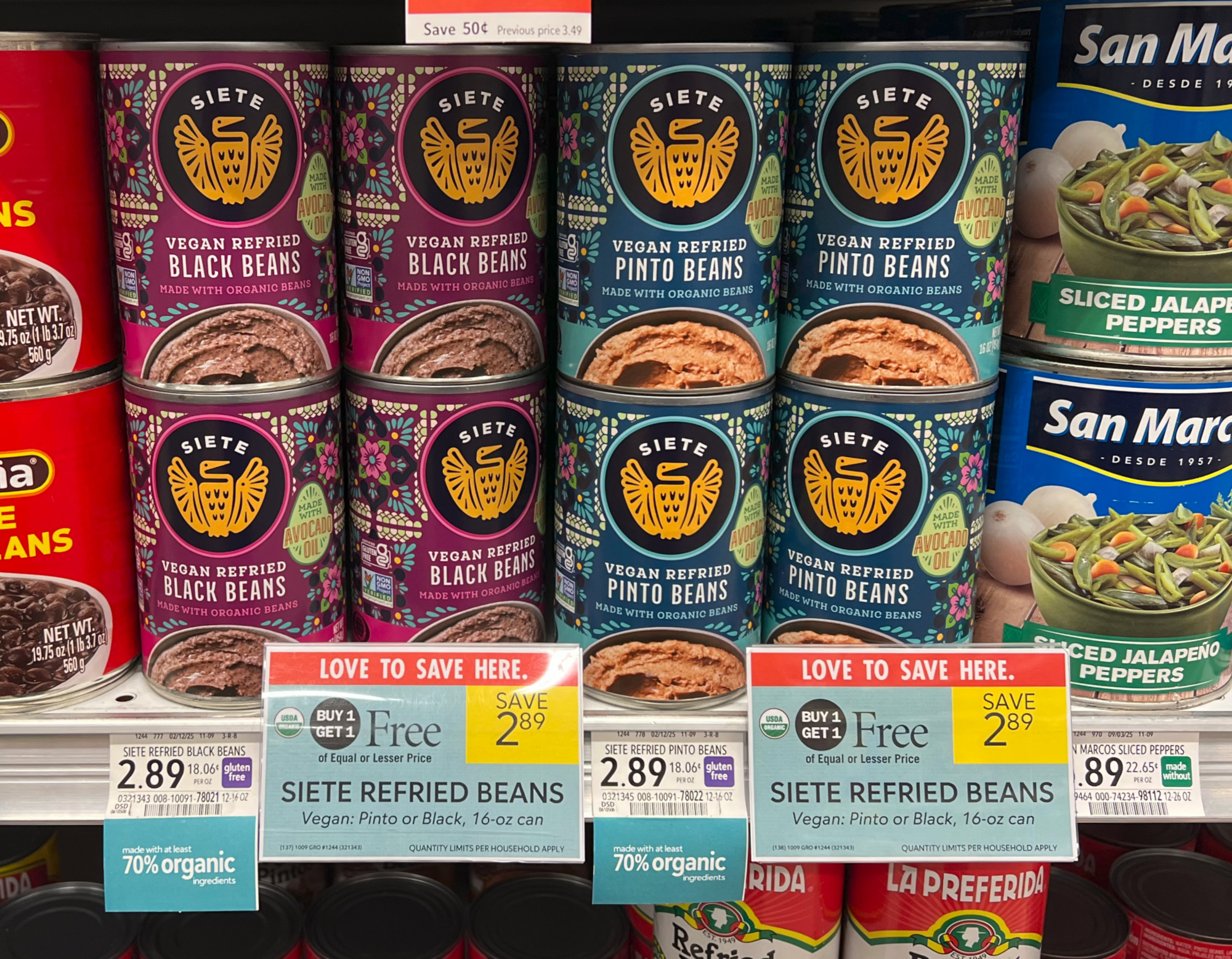 Siete Refried Beans, Vegan: Pinto or Black, 16 oz can, BOGO $2.89