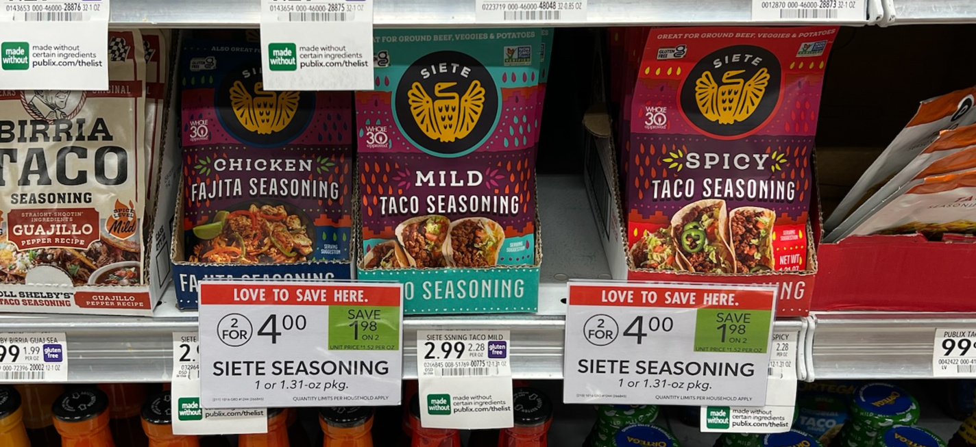 If you are a fan of Siete products, you might want to unlock the cash back offer to pick up a great discount at Publix. After discounts you pay just $1.83 for the taco seasoning packets.