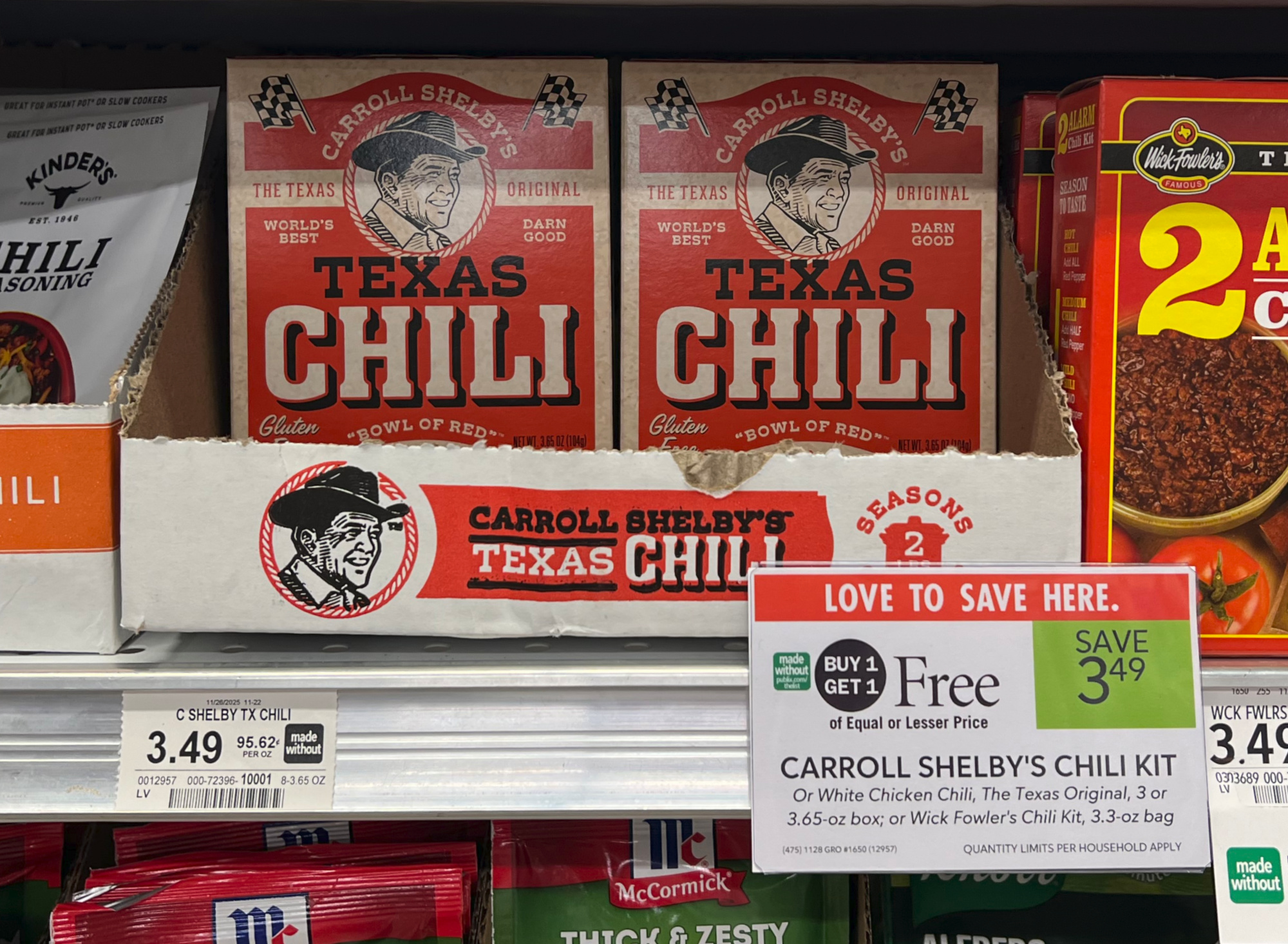 Carroll Shelby’s Chili Kit, or White Chicken Chili, 3 or 3.65 oz box, BOGO $3.49