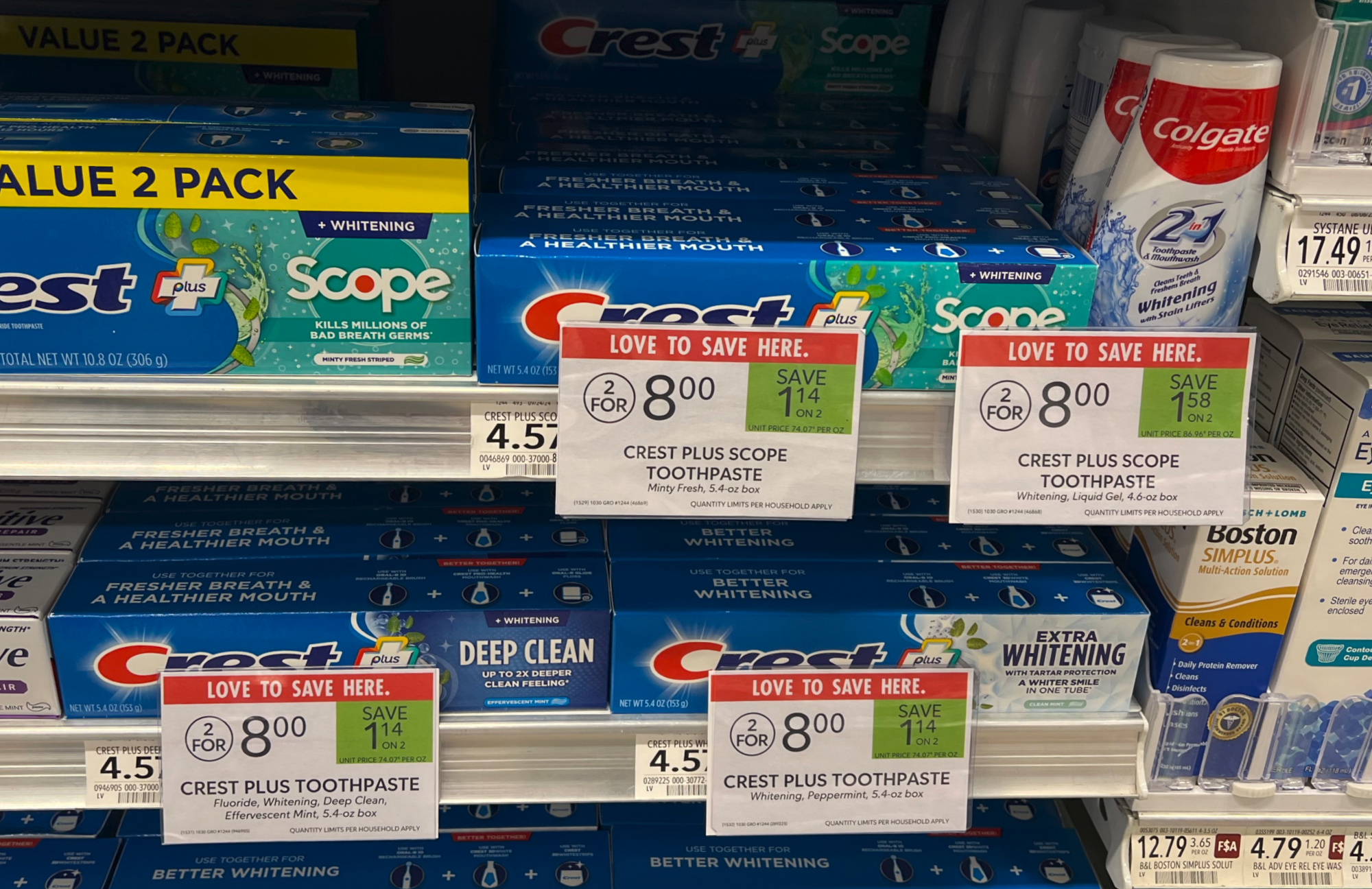 –$4/2 Adult Crest Paste 2.4oz or more, Crest 3DW Deep Stain Remover, Crest Kids Advanced OR Burt’s Bees Adult Paste 4.0oz or more, Crest, Scope OR Oral-B Mouthwash 473mL or larger, Scope Squeez, Oral-B Adult Manual Brush, Expandable/Oral-B Glide Floss OR Interdental Picks/Brush (excludes Crest Cavity, Baking Soda, Tartar, other Kids Variants, Oral-B Essential toothbrushes, Daily Clean, Complete 1ct brushes, Essential/Satin Floss, Oral-B Fresh Mint Picks, trial/travel sizes) (Publix Digital Coupon)