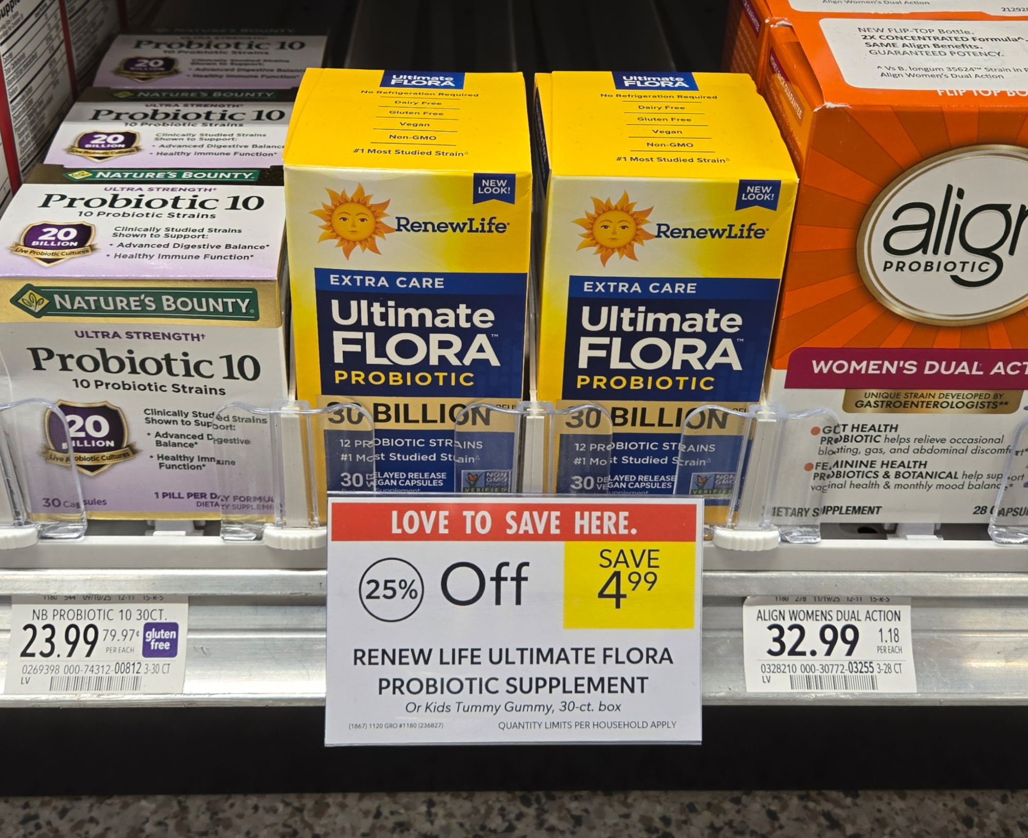 Look for a super deal on Renew Life Ultimate Flora Probiotic Supplement right now at Publix. With the sale, coupon, and cash back combo you can get the probiotic supplements as low as $7.99!