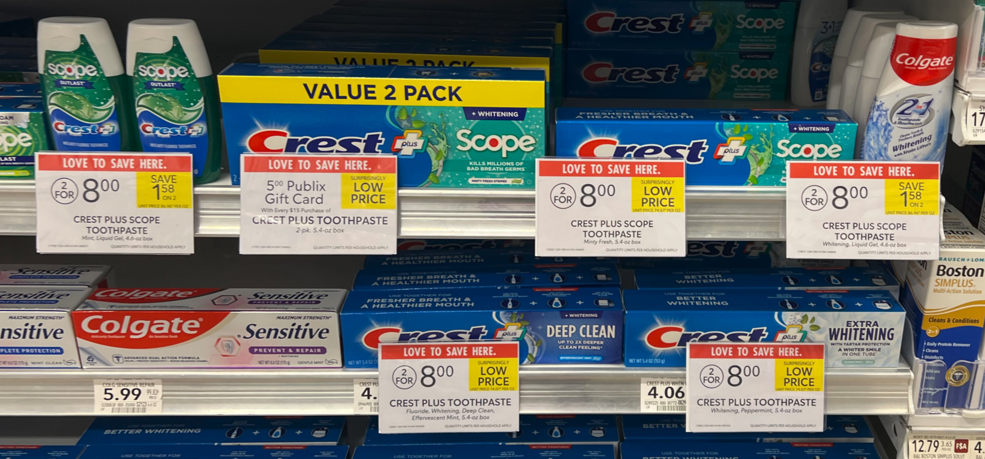 $2/1 Crest Toothpaste 2.4 oz or more (excludes Crest Cavity, Baking Soda, Tartar Control/Protection, Brilliance, Gum, Densify, Aligner Care, Kids, More Free packs, and trial/travel size) (Publix Digital Coupon)