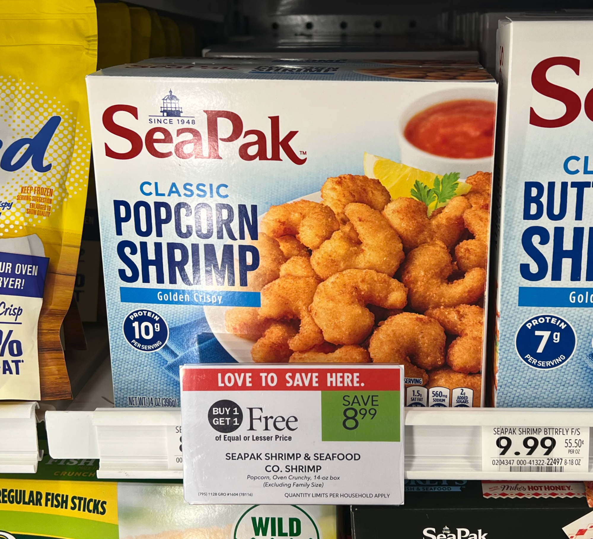 SeaPak Shrimp & Seafood Co. Shrimp, or Calamari, or Clams, or Morey’s Fish Fillets, 8.2 to 14 oz box, (Excluding Family Size), BOGO $8.99