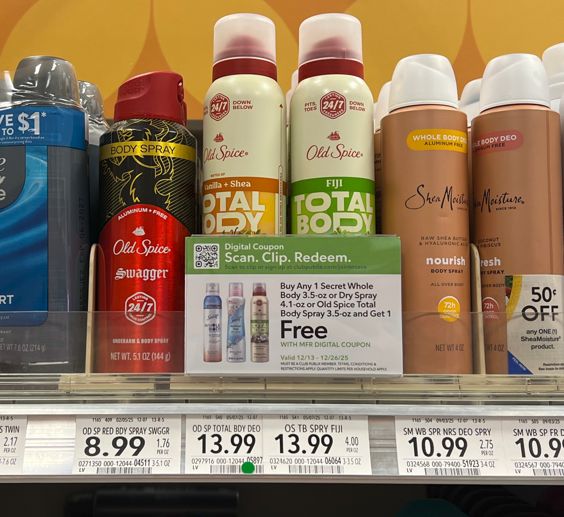 –B1G1 Secret Whole Body 3.5 oz OR Secret Dry Spray 4.1 oz OR Old Spice Total Body Spray 3.5 oz and Get ONE (1) Secret Whole Body 3.5 oz OR Secret Dry Spray 4.1 oz OR Old Spice Total Body Spray 3.5 oz FREE (up to $13.99) (Publix Digital Coupon)