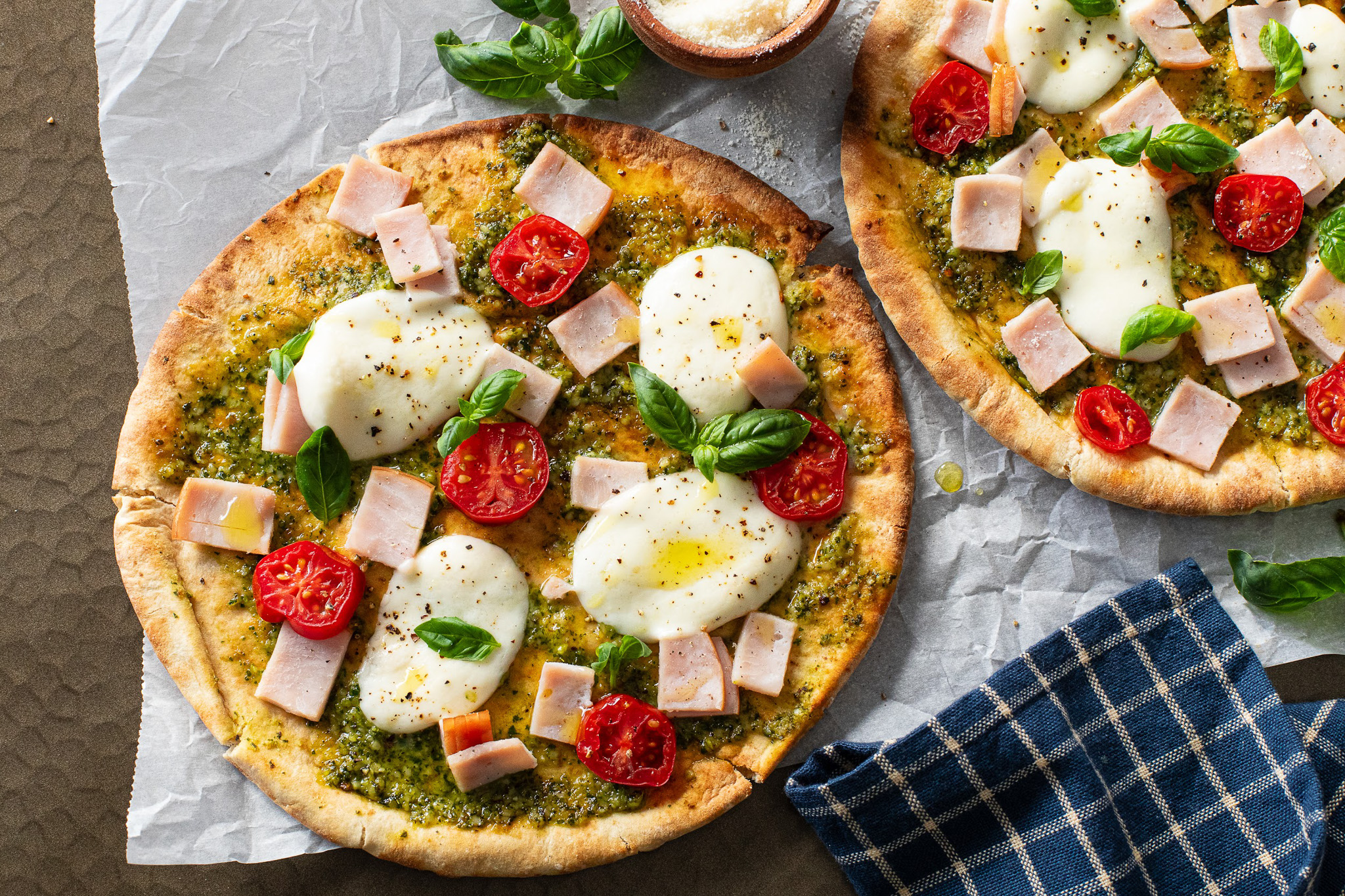 - Lay your flatbread on a baking sheet. Spread 1 tablespoon of pesto and then layer on the mozzarella, followed by the Canadian Bacon slices and cherry tomatoes.