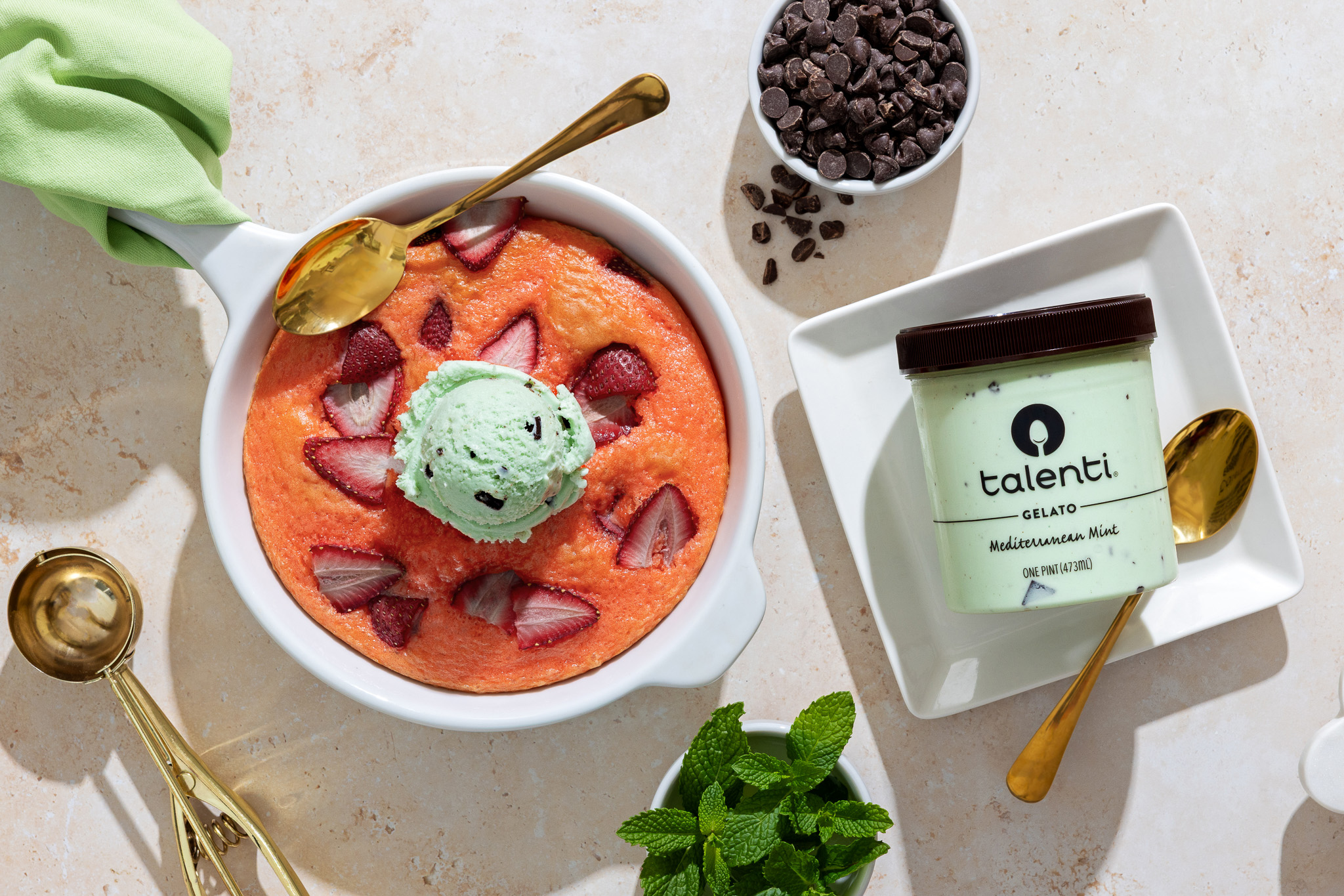 - Bake for 30 to 35 minutes until set but soft in the center. Cool 10 to 15 minutes before serving. Top skillet with 1 large scoop Talenti Mediterranean Mint Gelato.