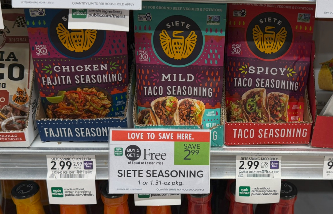 If you are a fan of Siete products, you might want to unlock the cash back offer to pick up a great discount at Publix. After discounts you pay just $1.25 for the taco seasoning packets.